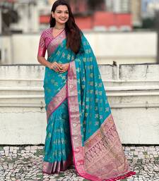 Teal patola silk saree meenakari weaves & zari pallu with contrast blouse piece