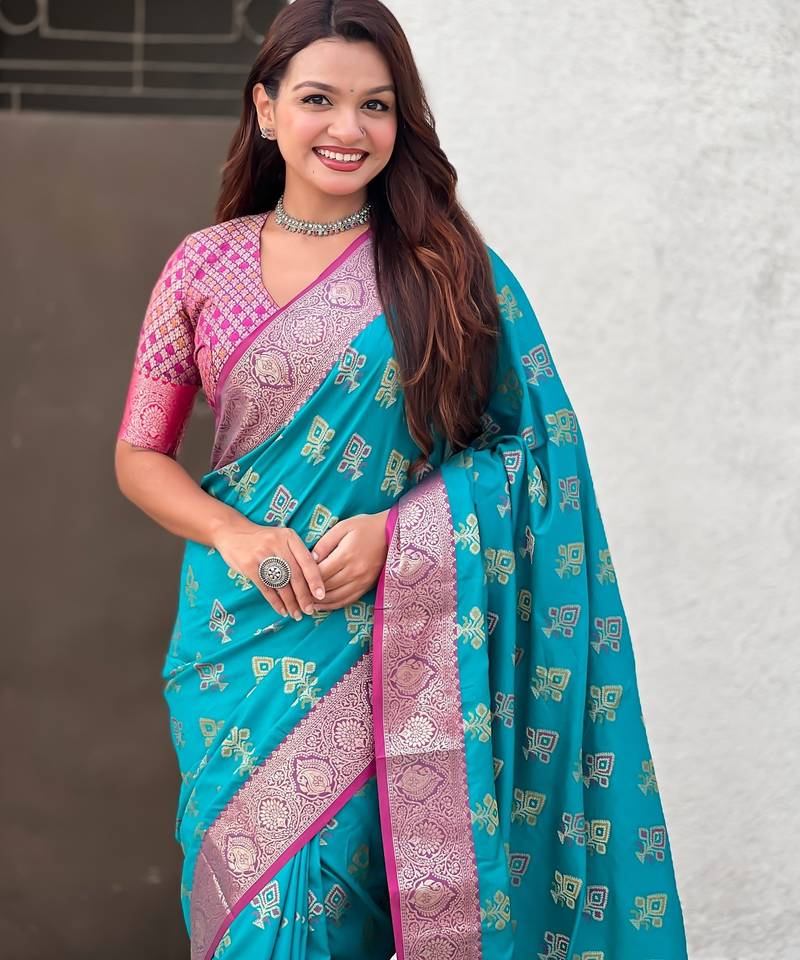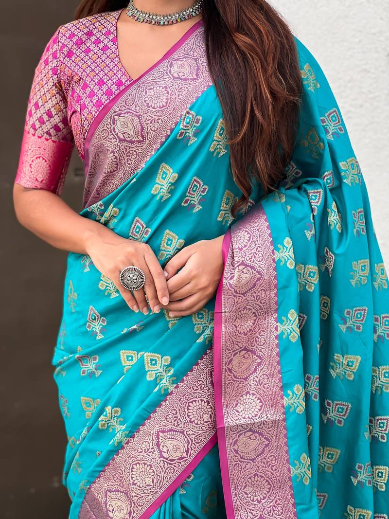 | Product Name | Teal Patola Silk Saree Meenakari Weaves & Zari Pallu With Contrast Blouse Piece | |