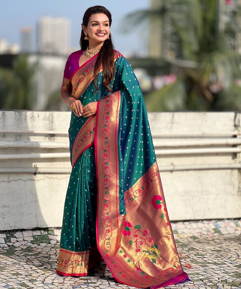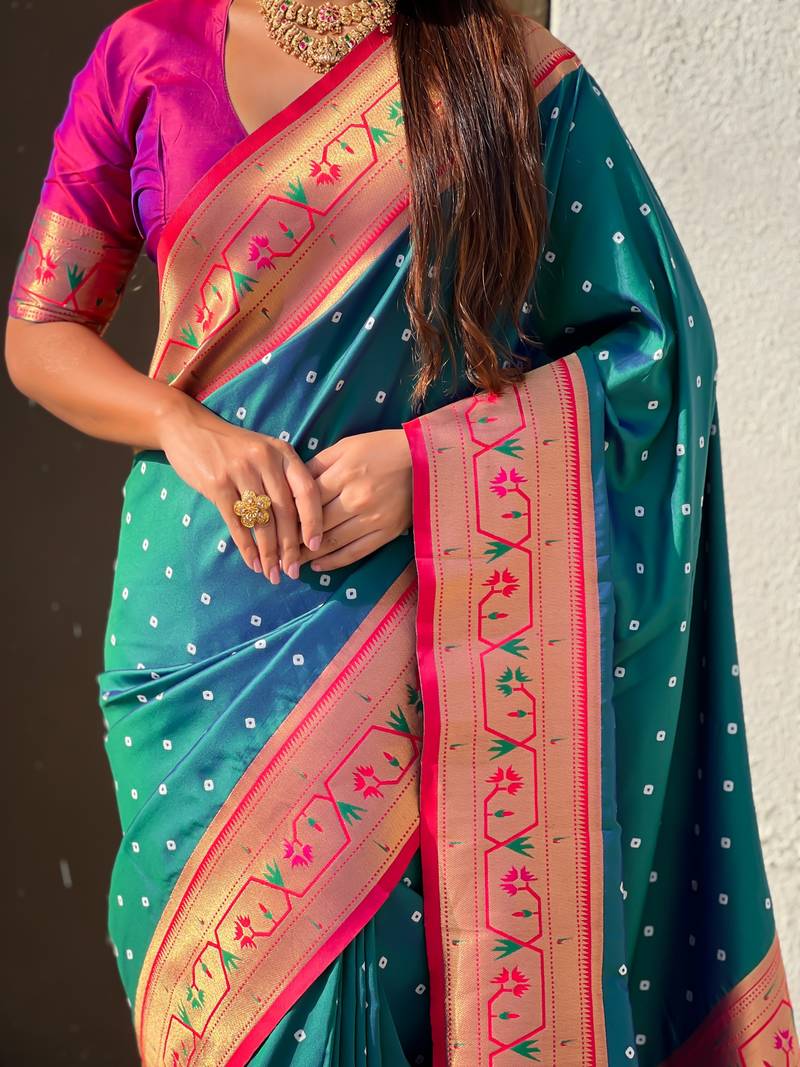 | Product Description | Soft Silk Sarees With Bandhani Zari Woven Motifs All Over The Body Having Rich Woven Paithani Meenakari Pallu And Paithani Simple Contrast Border Paired With Plain Contrast Blouse Same As |