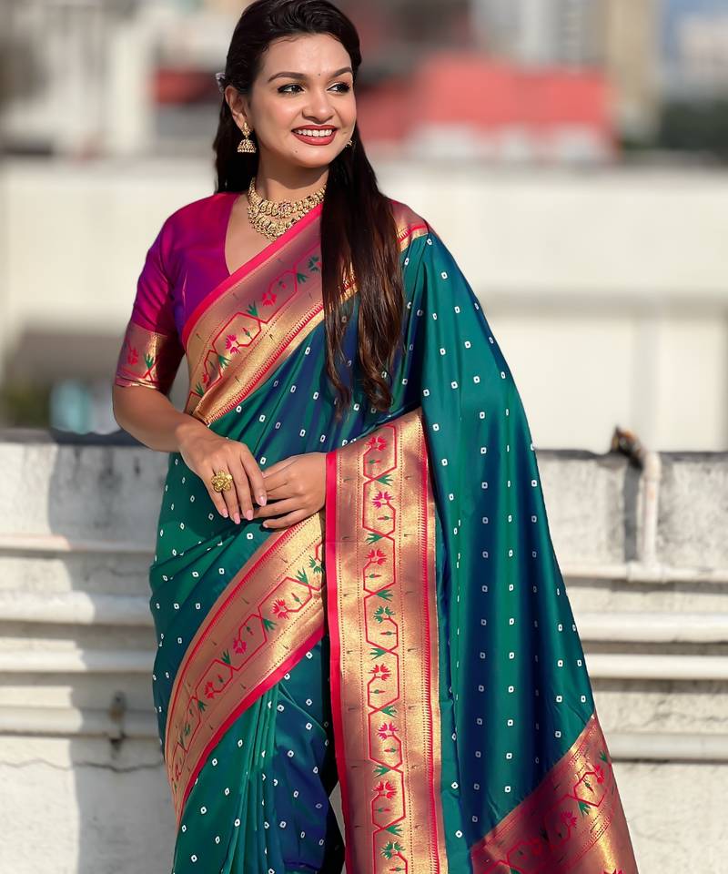 Teal soft silk bandhani zari weaving saree with contrast blouse piece