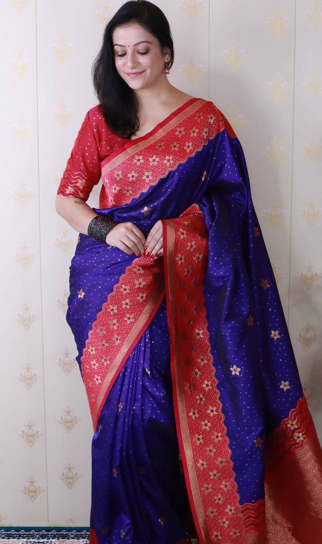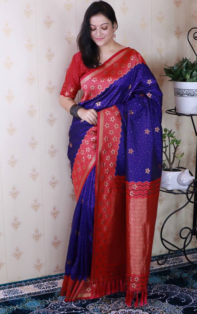 | Product Description | Step Into Timeless Elegance With This Premium Banarasi Soft Silk Saree, Exquisitely Woven With Gold Zari Floral Motifs All Over The Body, Giving It A Royal And Traditional Appeal. |