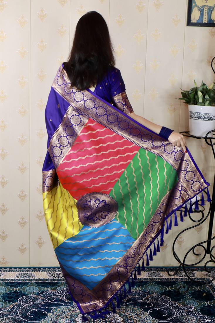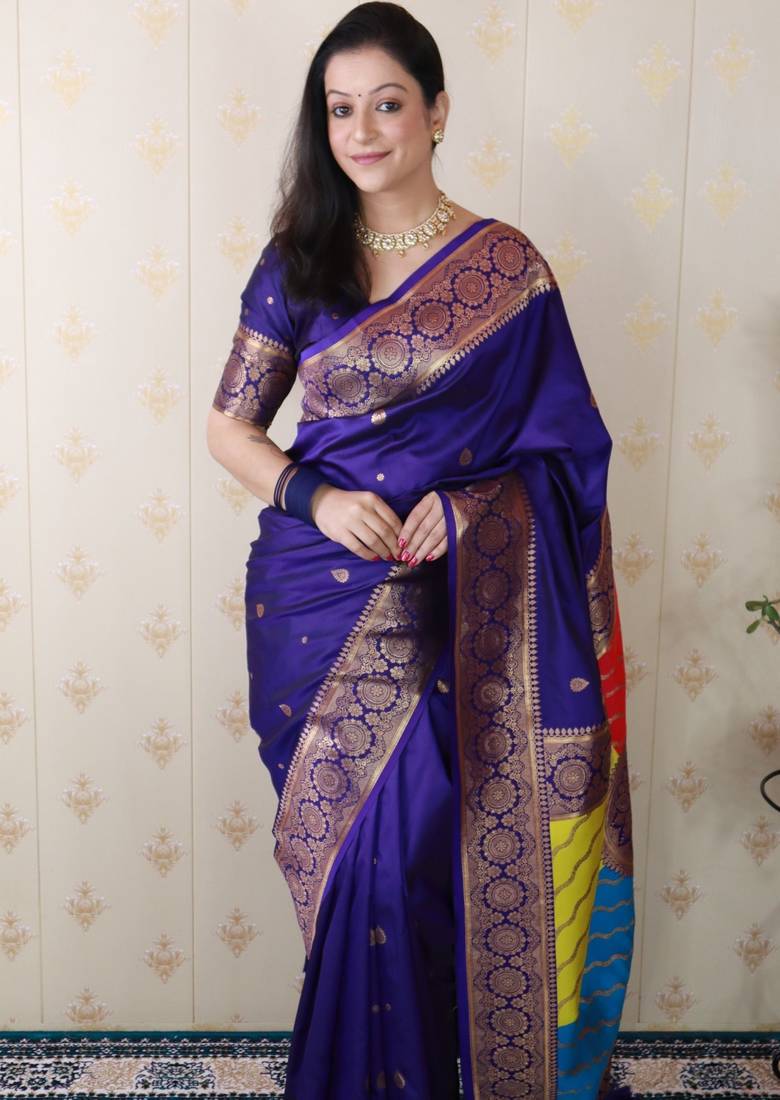 | Product Description | Premium Banarasi Soft Silk Sarees With Gold Zari Motifs All Over The Body, Having Rich Zari Woven Rangkaat Multicolor Pallu And Paired With Brocade Running Blouse |