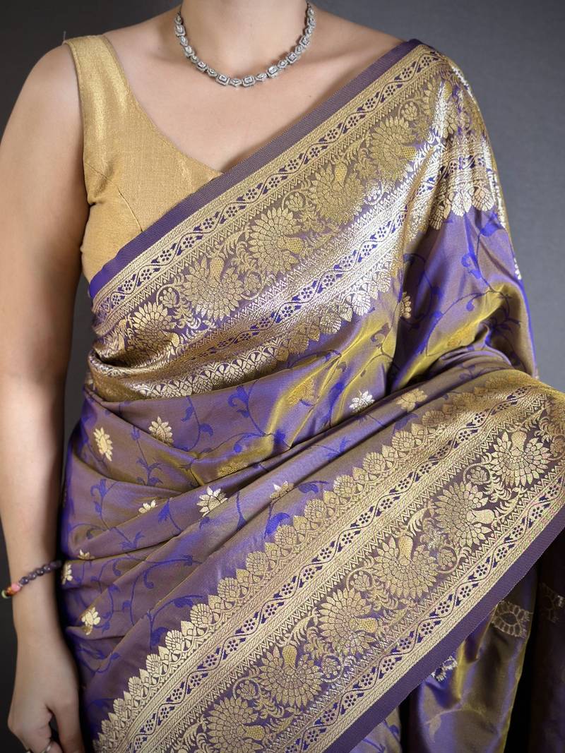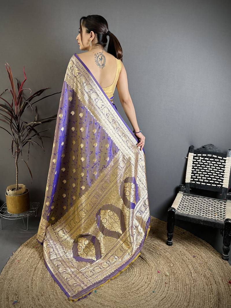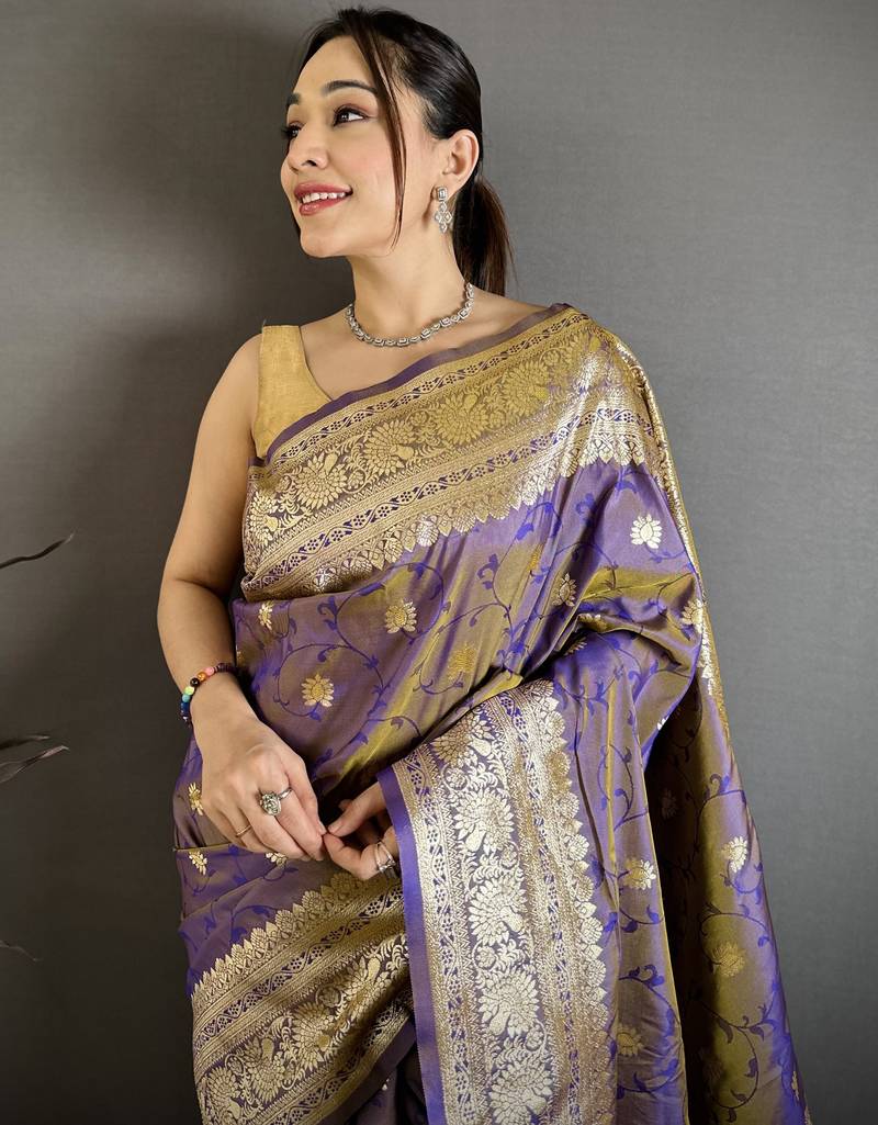 Violet soft banarasi silk zari weaving saree with matching blouse piece