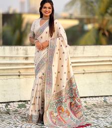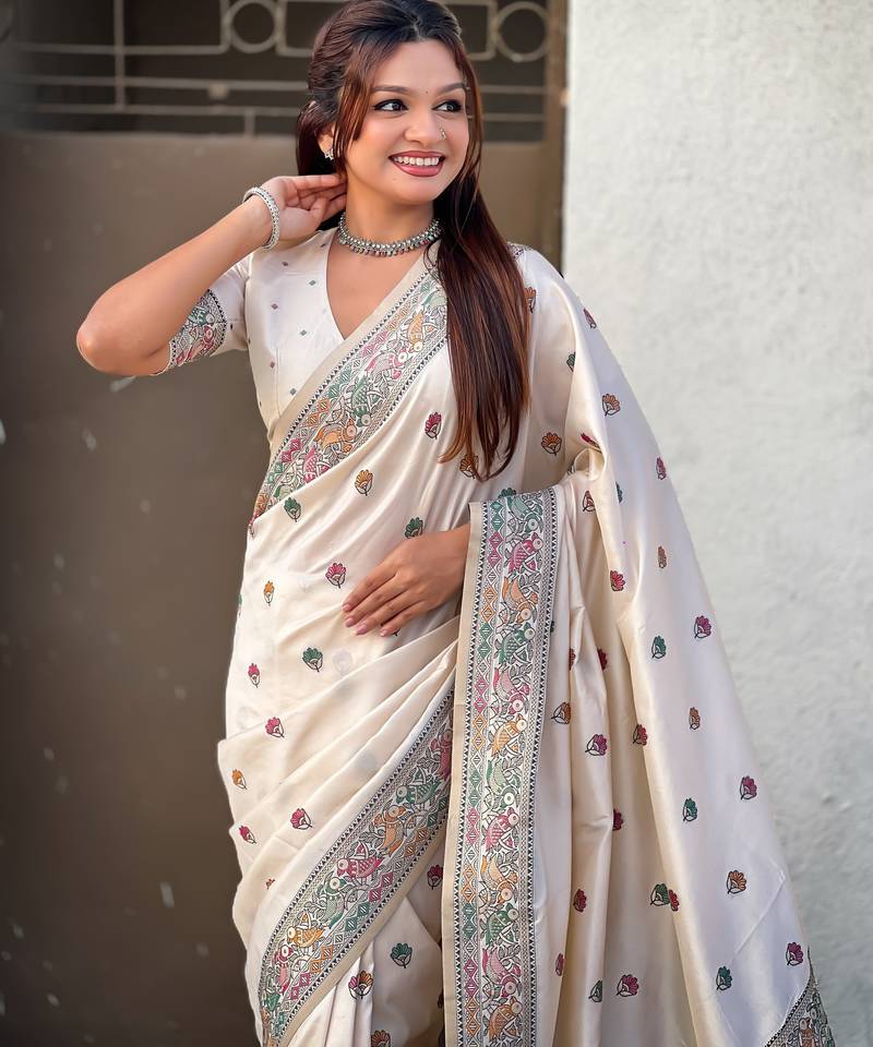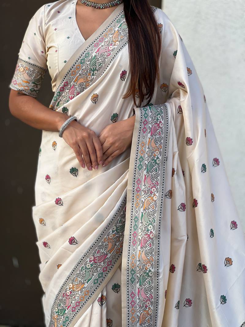 White soft silk baluchari zari meena weaving saree with matching blouse piece