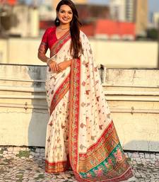 White viscose silk position print & zari weaving saree with contrast blouse piece