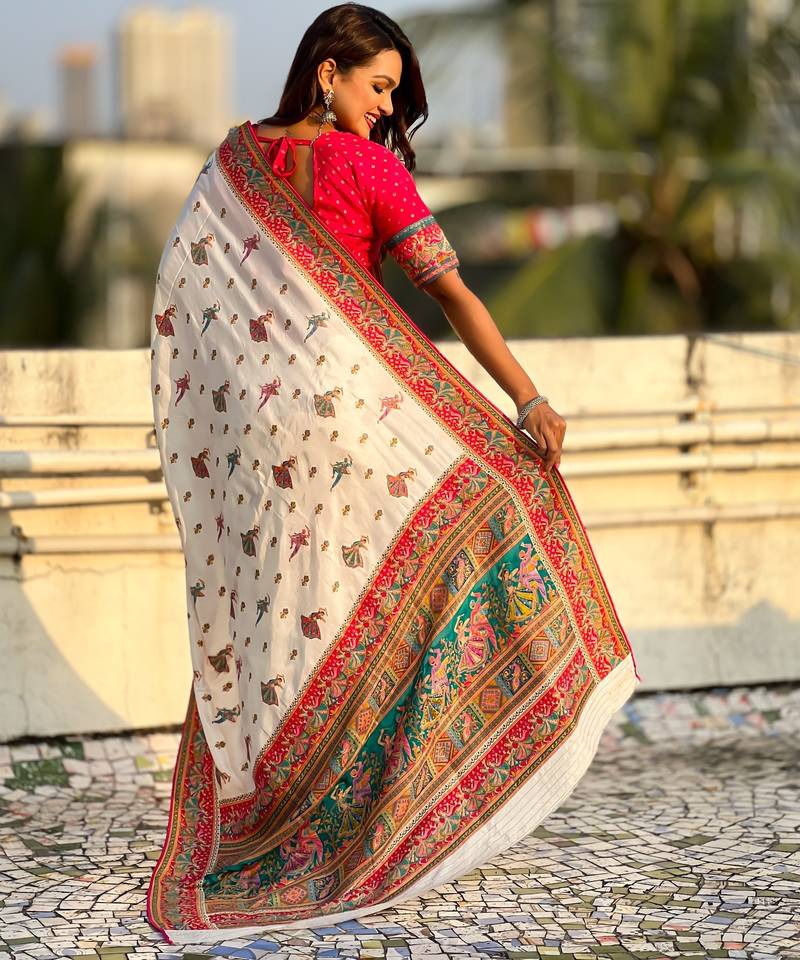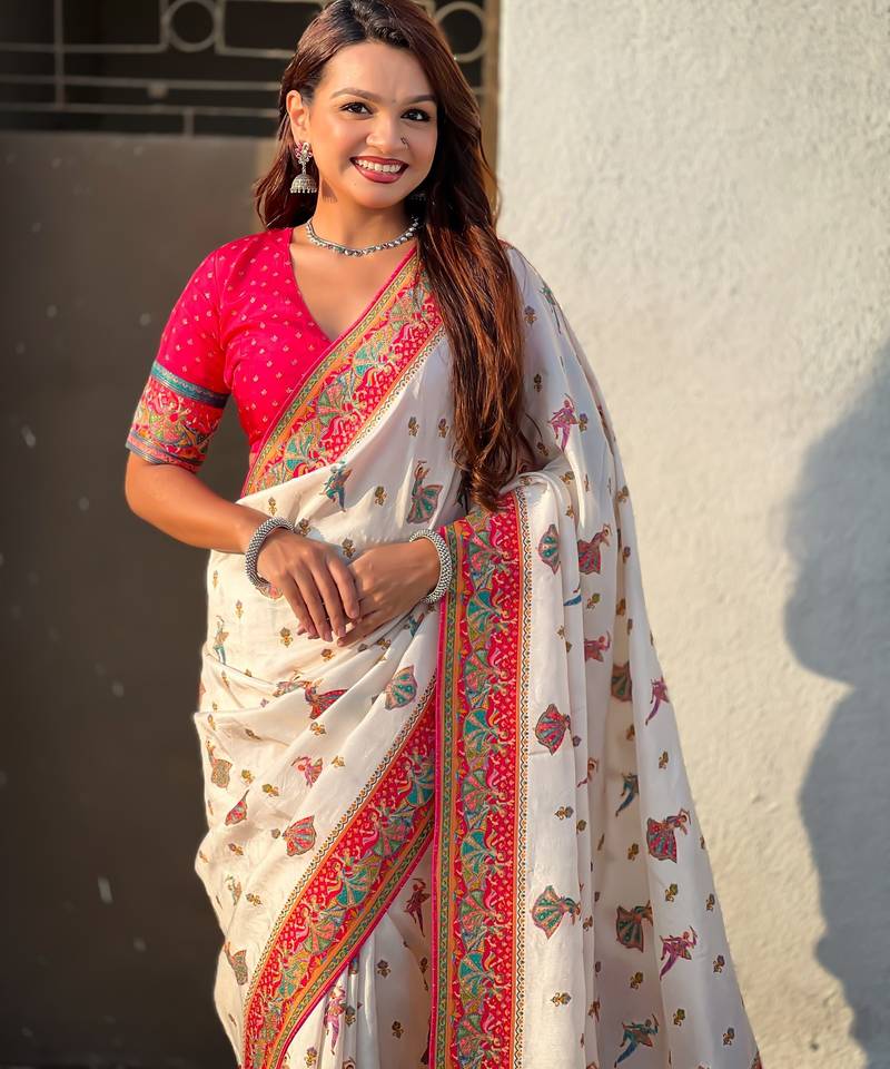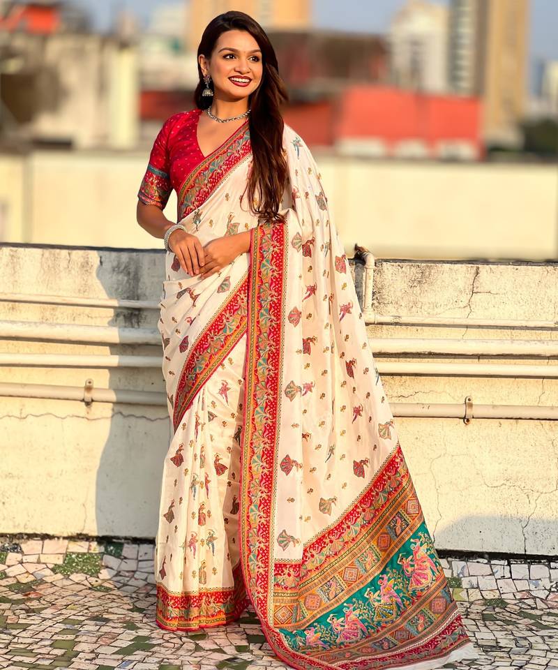 | Product Name | White Viscose Silk Position Print & Zari Weaving Saree With Contrast Blouse Piece | |