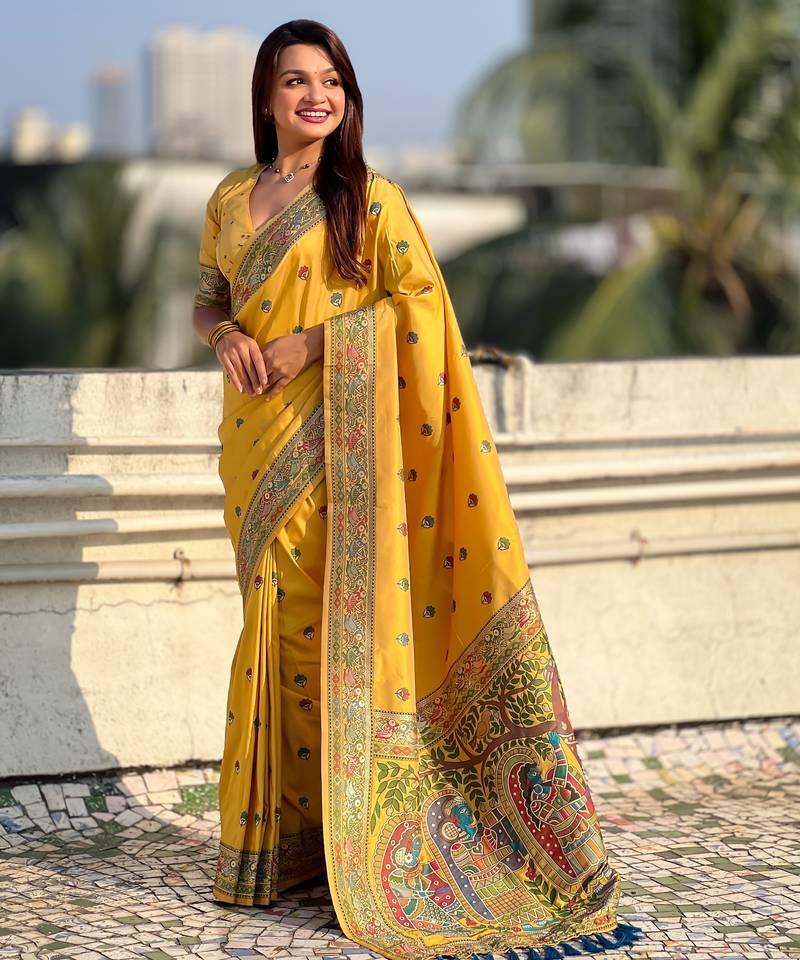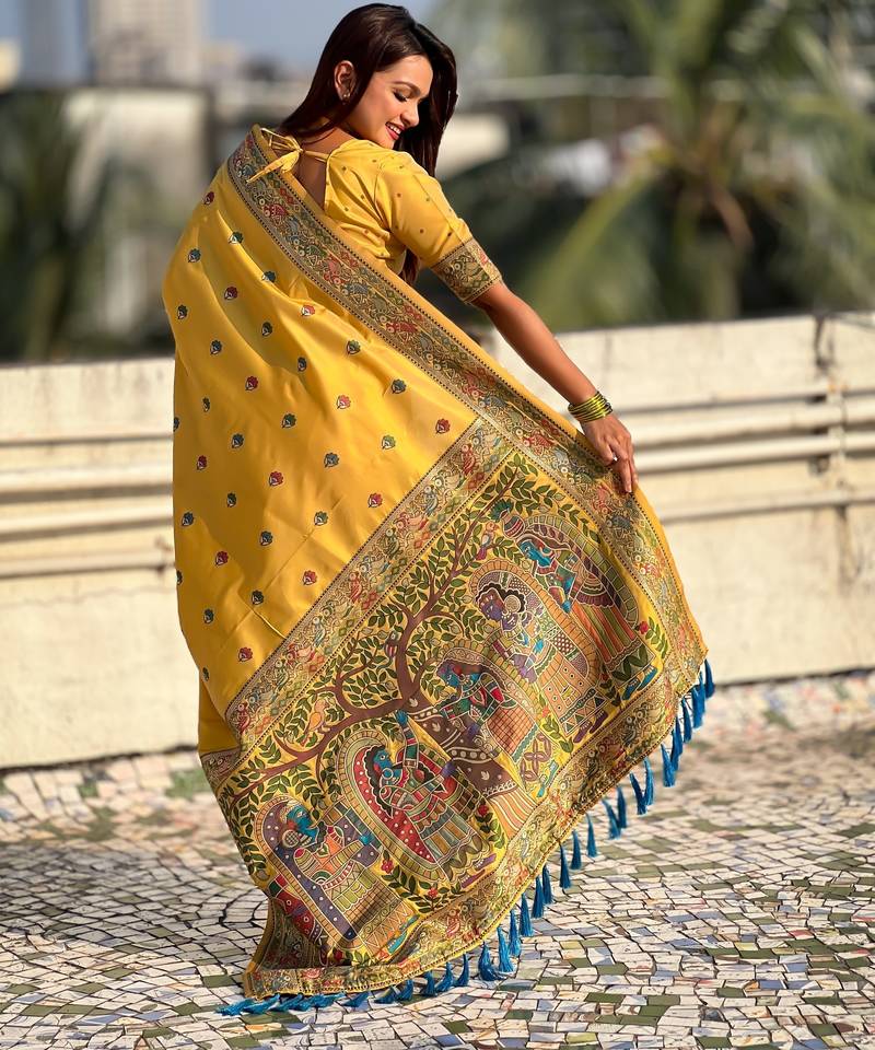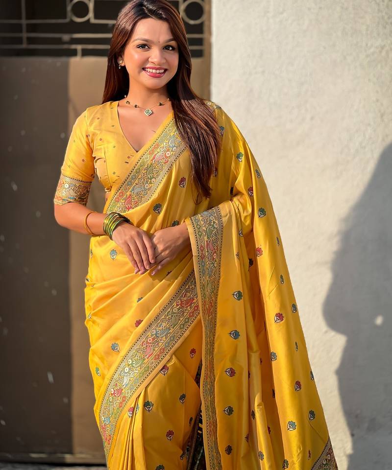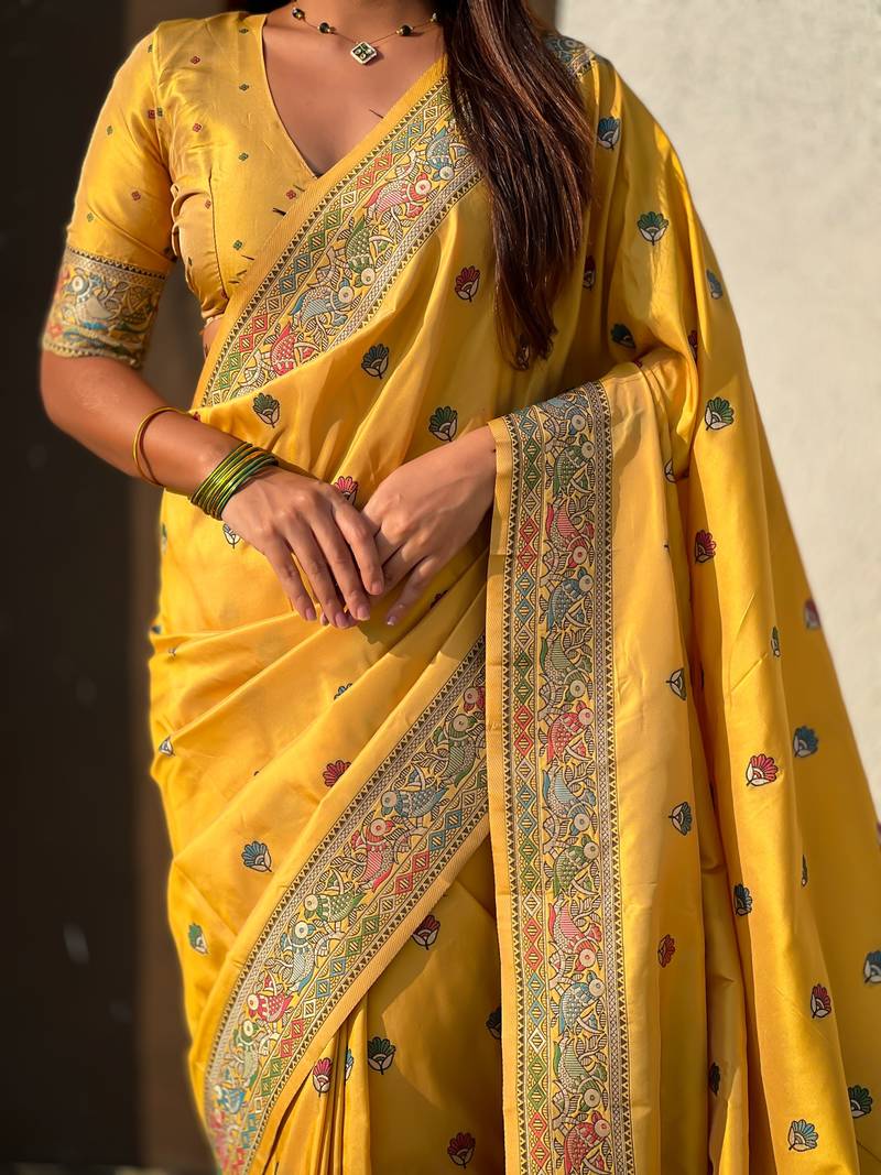 Yellow soft silk baluchari zari meena weaving saree with matching blouse piece