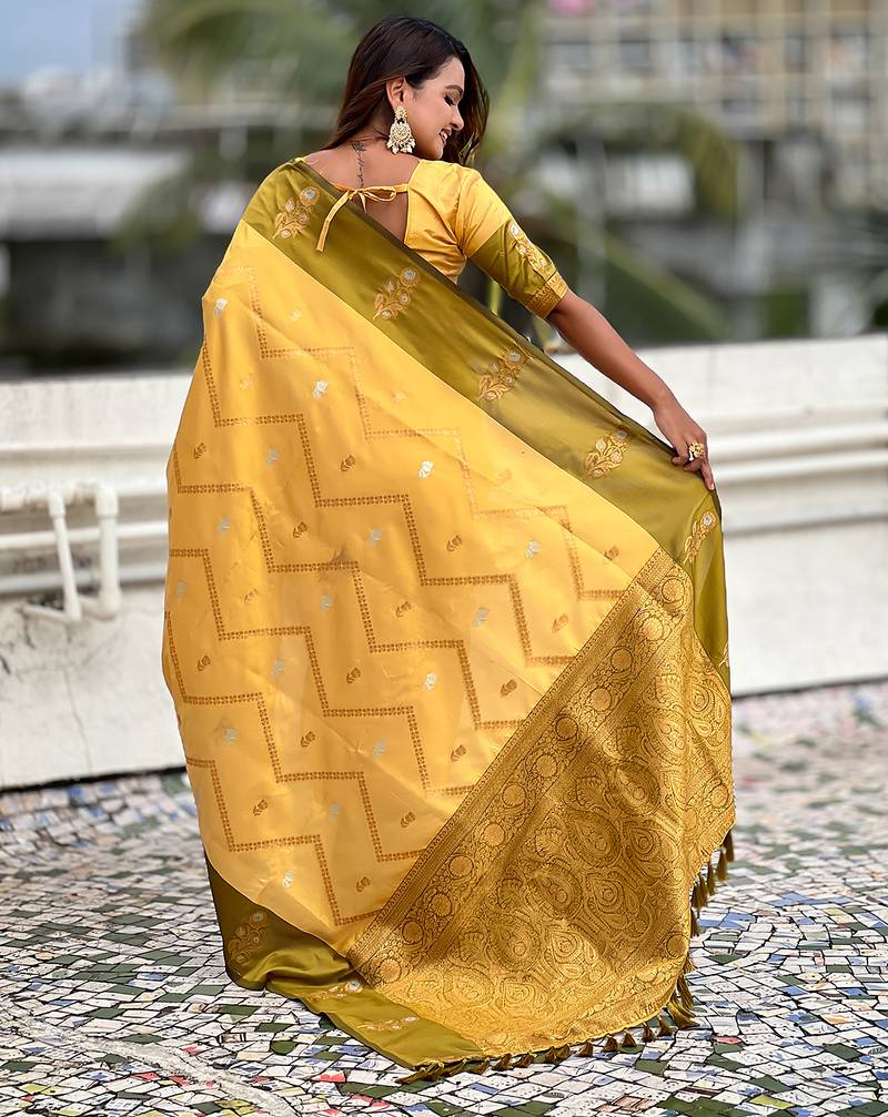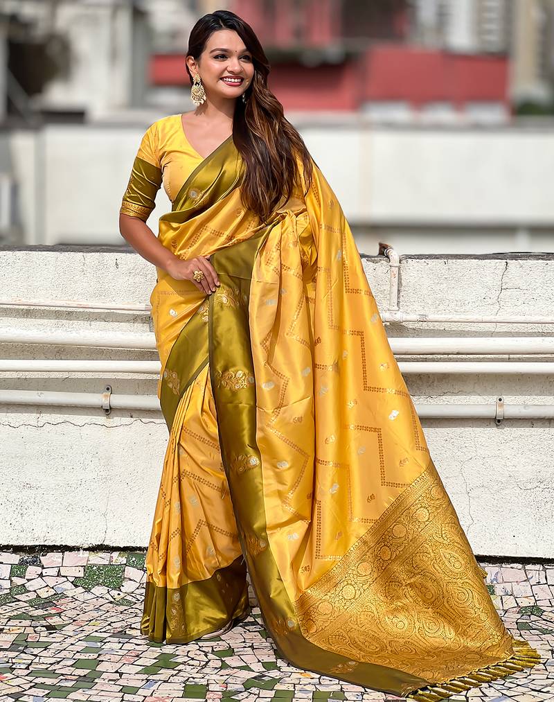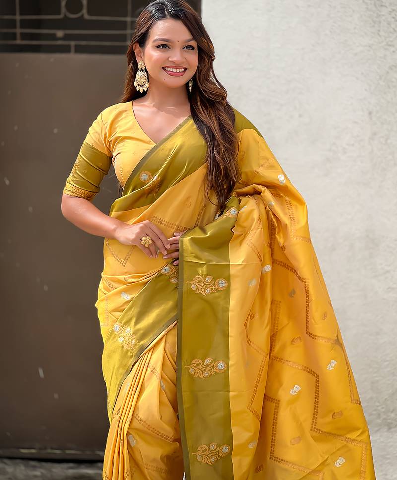 Yellow soft silk zari weaving saree with matching blouse piece