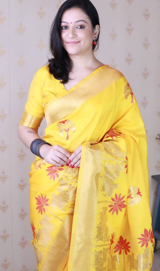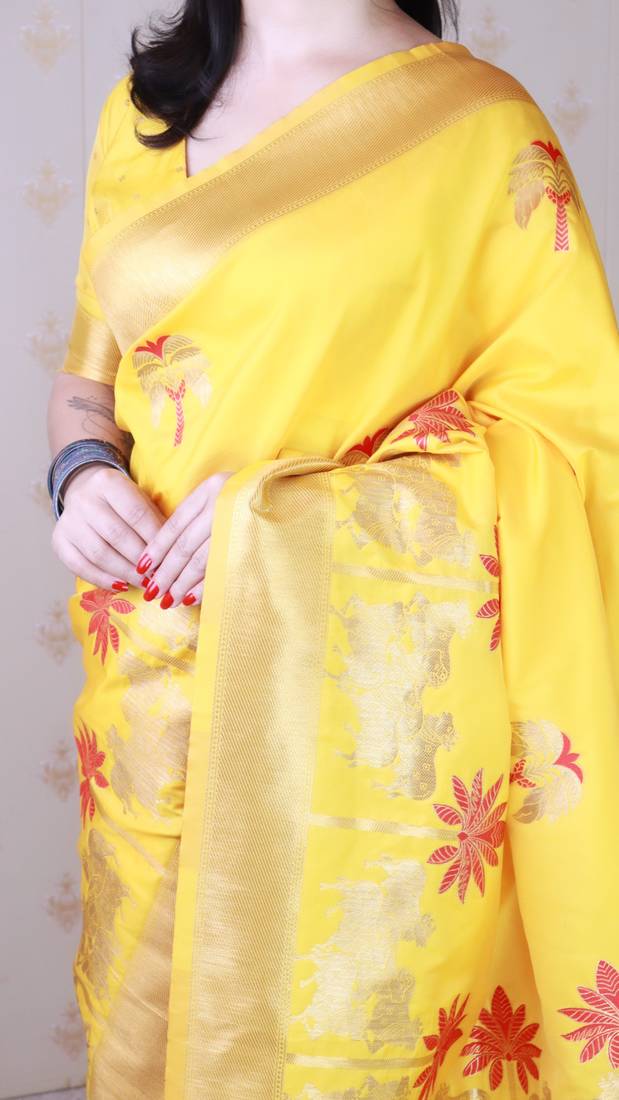 Yellow soft silk zari weaving saree with matching blouse piece