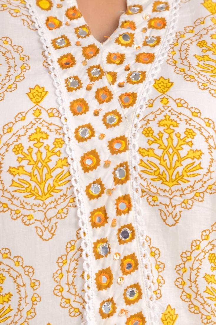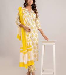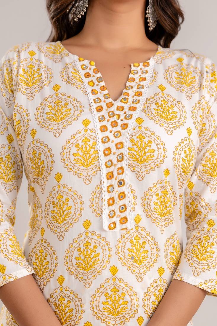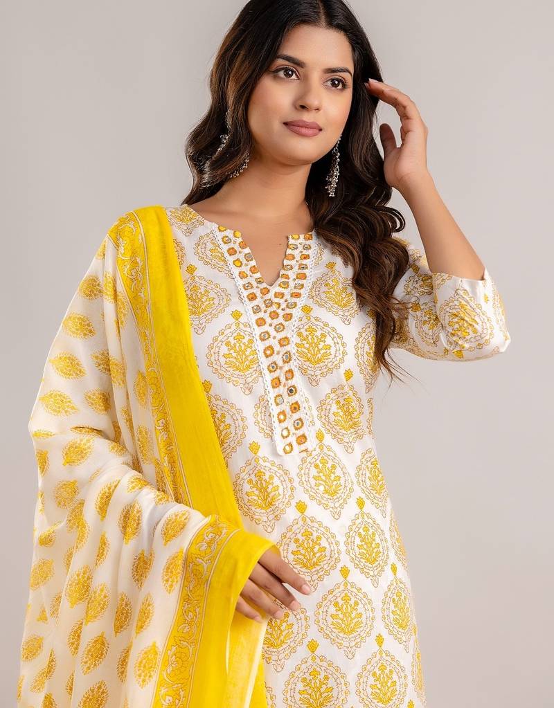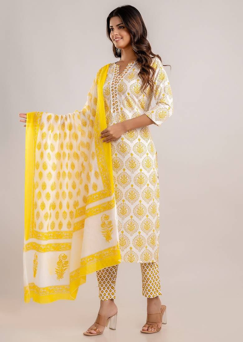 | Product Name | Yellow White Floral Block Printed Indian Readymade Straight Salwar Kameez Kurti Pant Dupatta Set | |