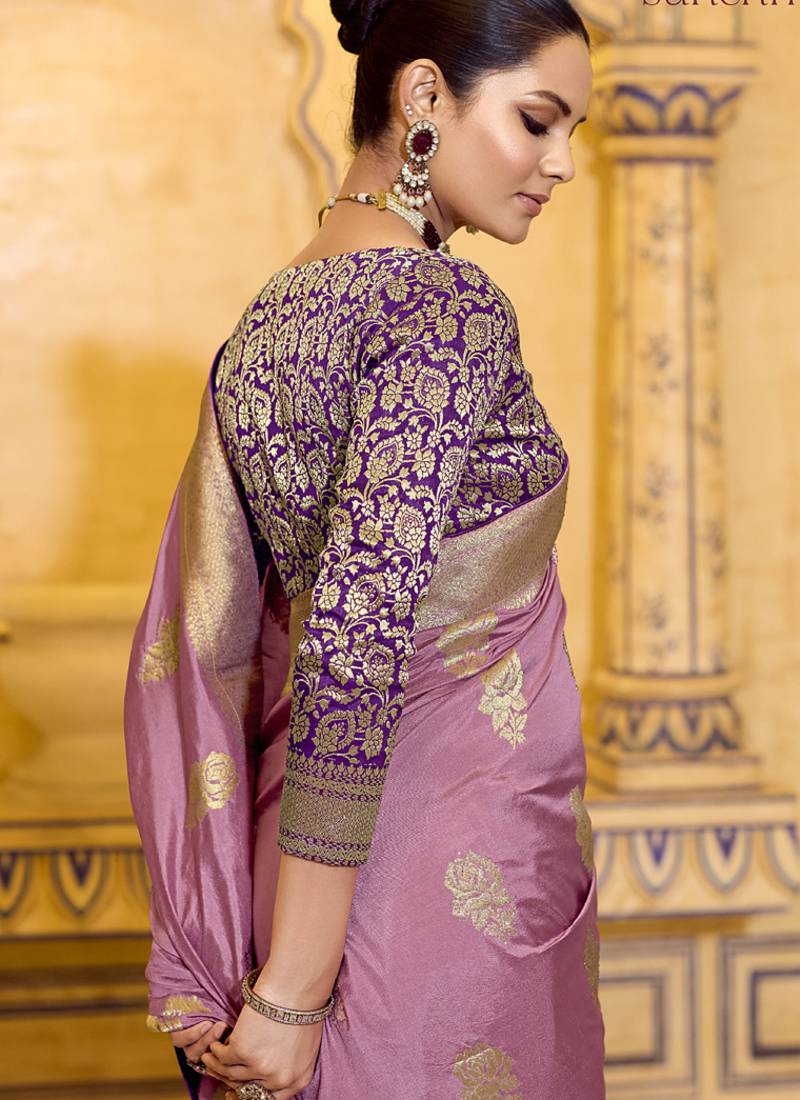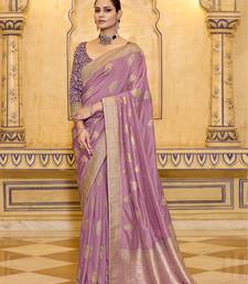 Onion pink crepe silk saree, beautifully crafted with rich zari weaving