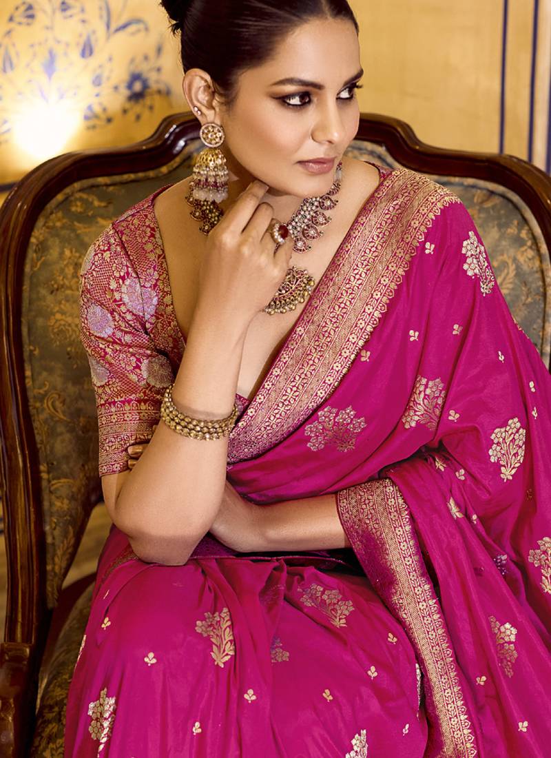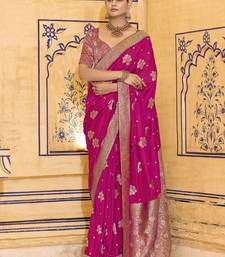 Rani pink crepe silk saree, beautifully crafted with rich zari weaving