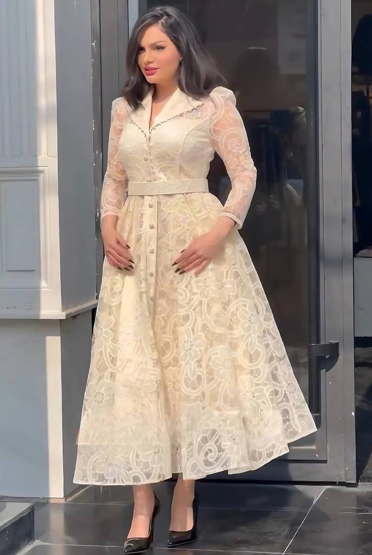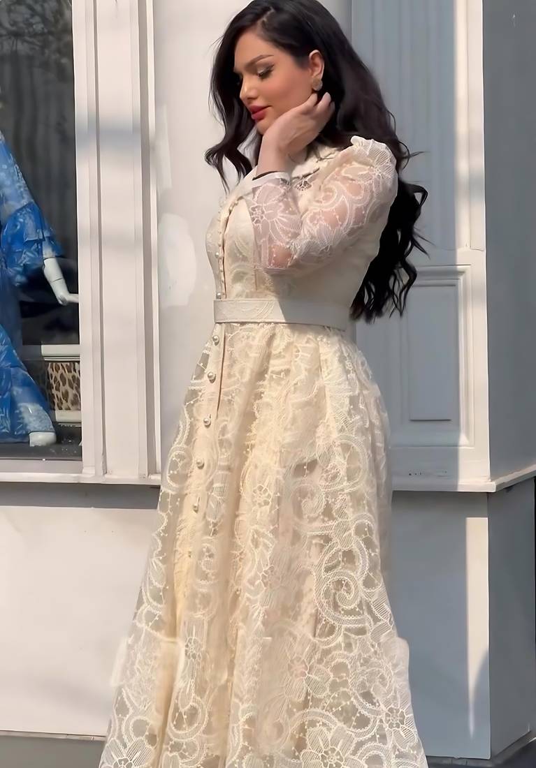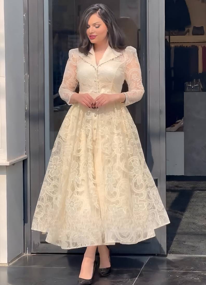 | Product Name | Cream Floral Thread Embroidered Net Lace A Line Long Dress | |