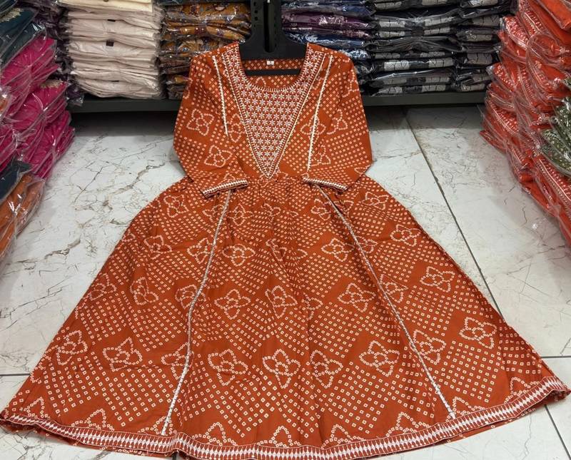 | Product Name | Orange Cotton Embroidered Bandni Pattern 3 Piece Anarkali Suit Set | |
