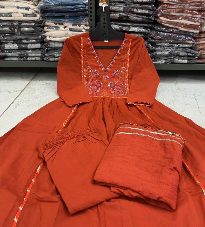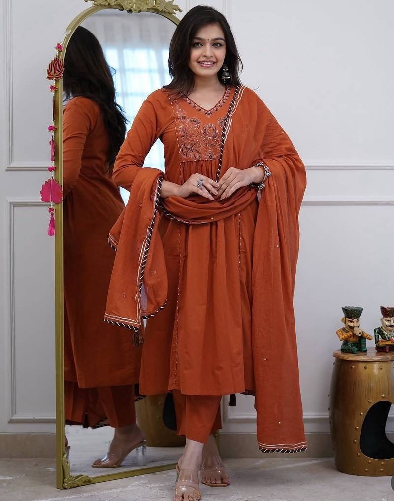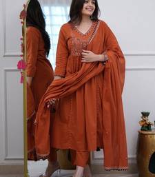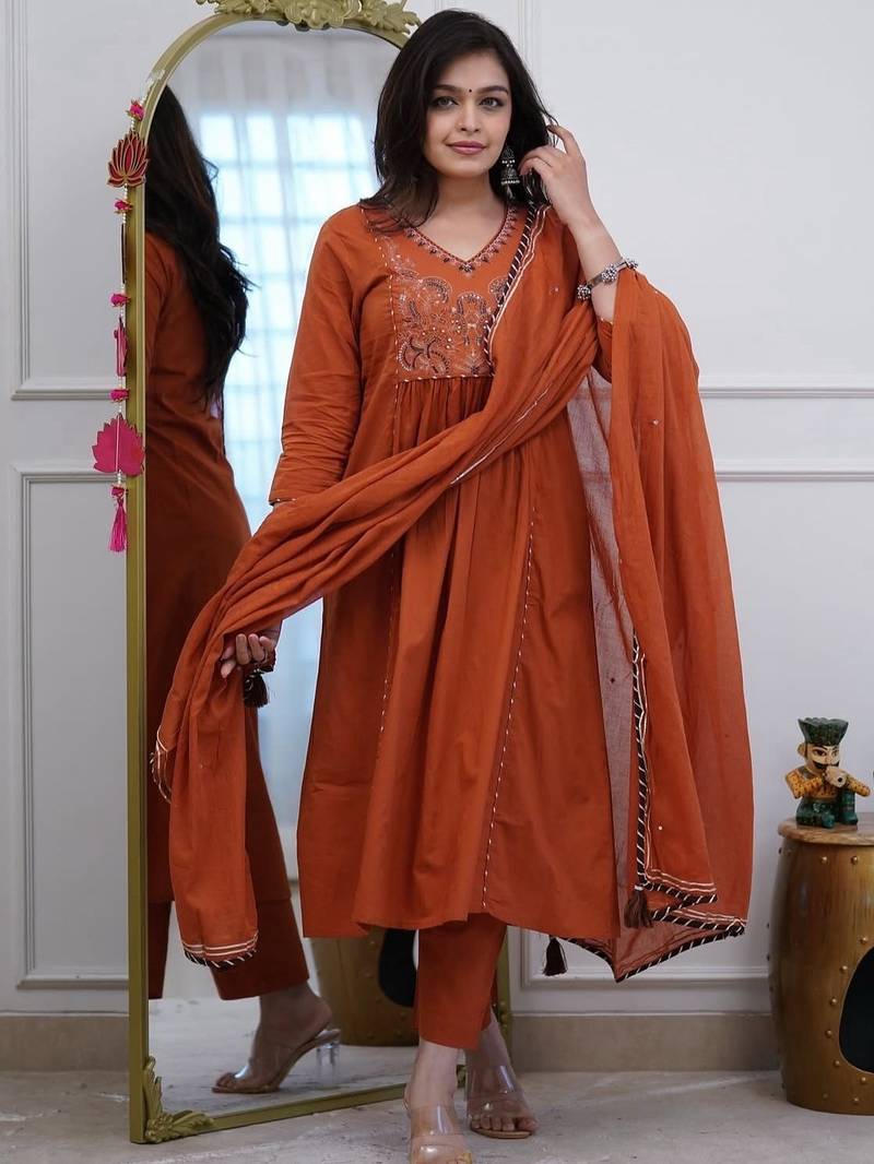 | Product Name | Orange V Neck Ethnic Embroidered Indian Salwar Kameez Kurti Pant Dupatta Set For Women | |