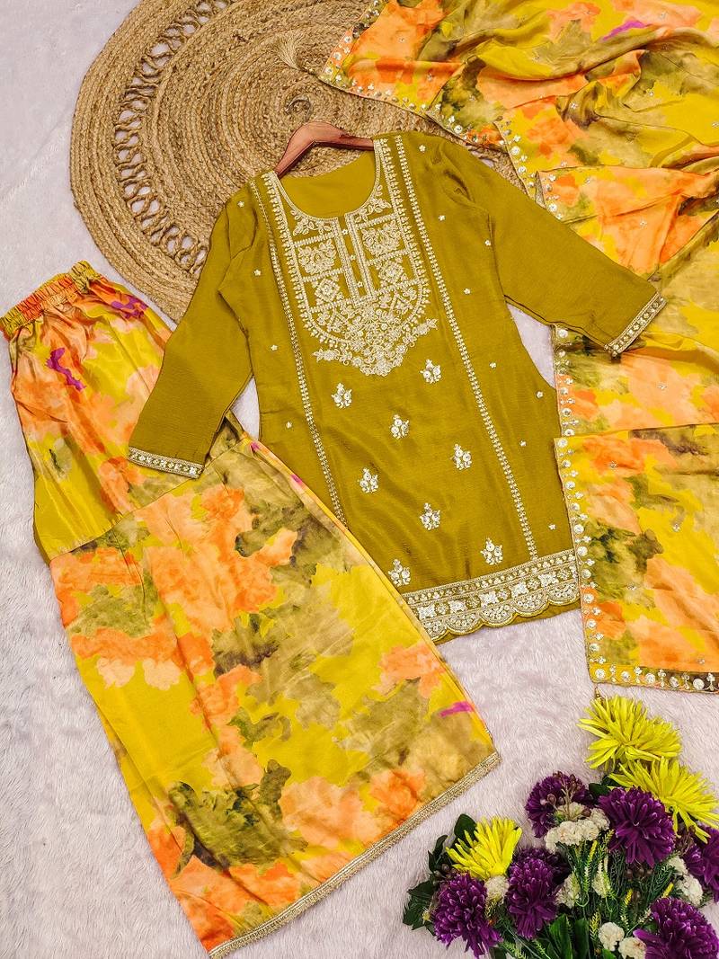 | Product Description | This Vibrant Yellow Suit Crafted From Luxurious Chinon Silk Features Intricate Embroidery, Adding Elegant Texture And Depth To Your Ensemble. Paired With A Comfortable Palazzo And A Matching Dupatta, This Set Balances Tradition With Modern Style, Offering Both Grace And Ease For Special Occasions. The Breathable Chinon Fabric Ensures A Lightweight And Smooth Fit, Making It A Refined Choice For Festive Or Formal Wear.