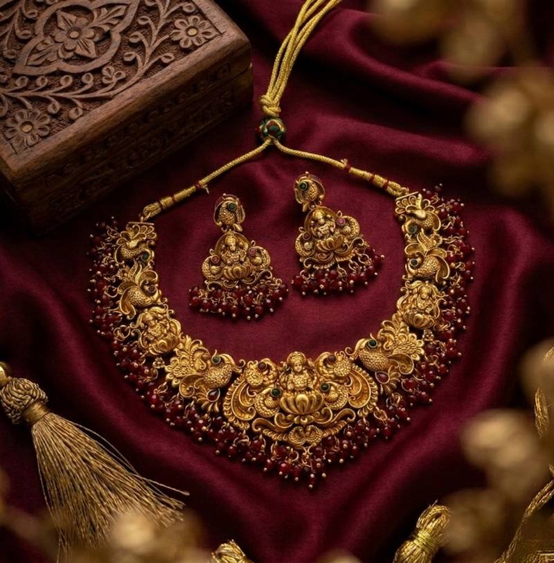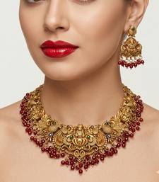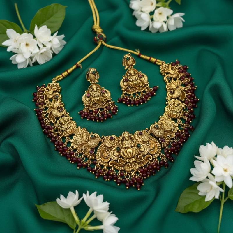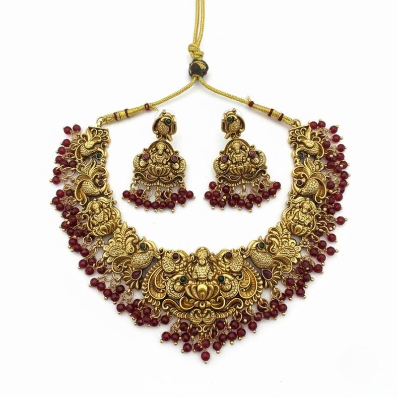 | Product Name | Antique Gold Plated Temple Jewelry Set: Handcrafted Goddess Lakshmi & Peacock Necklace With Jhumka Earrings | |