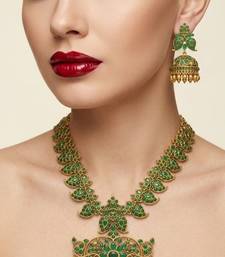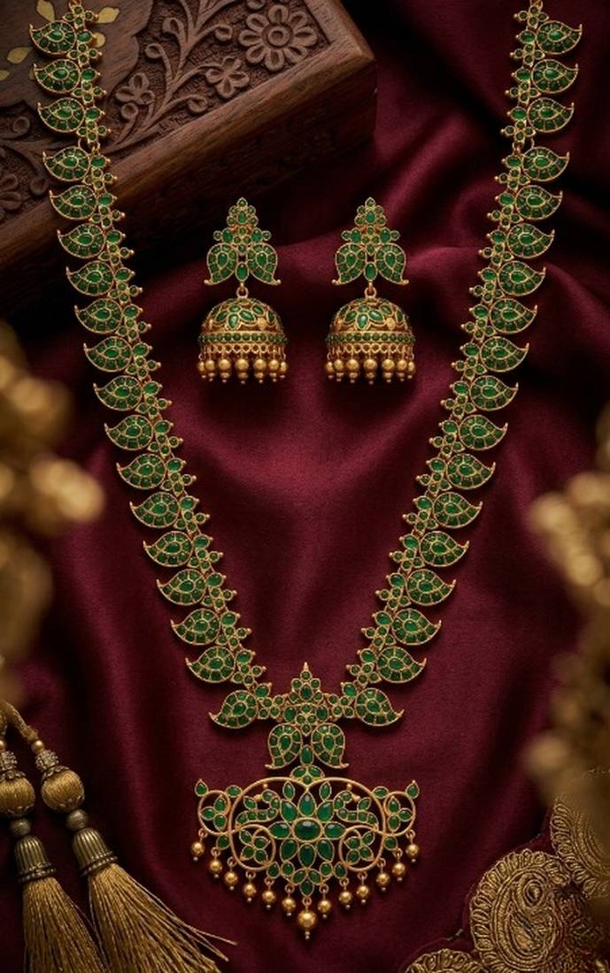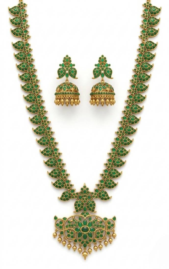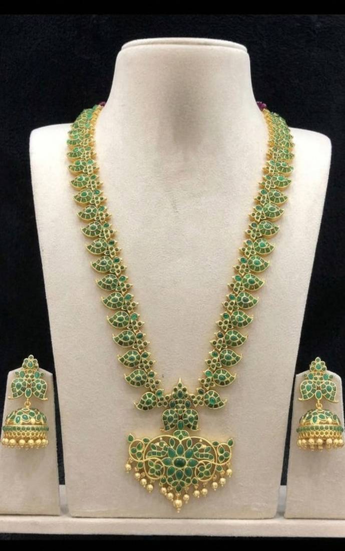 | Product Name | Elegant Green Matte Gold Plated Kemp Mango Haram Necklace Set With Jhumkas | |