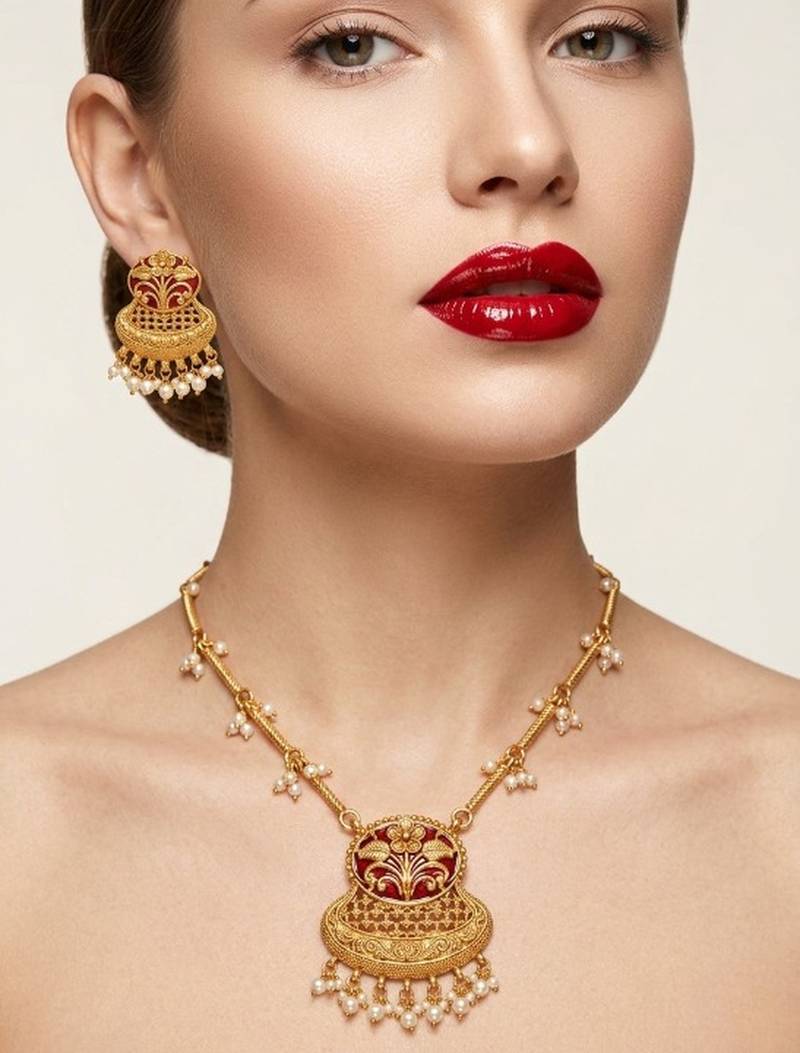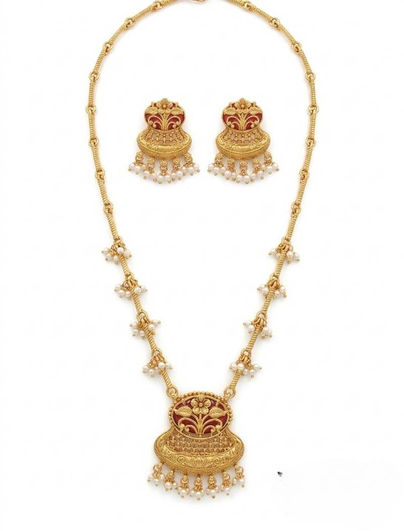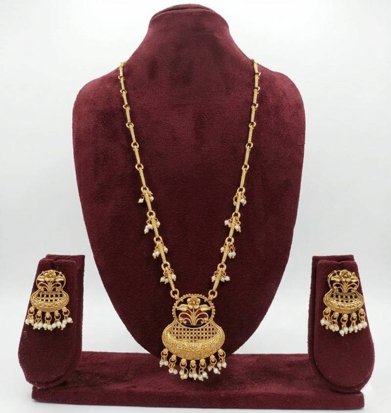 | Product Name | Exquisite Gold Plated Long Necklace Set With Pearl Drops | Traditional Ethnic Indian Bridal Jewelry | |