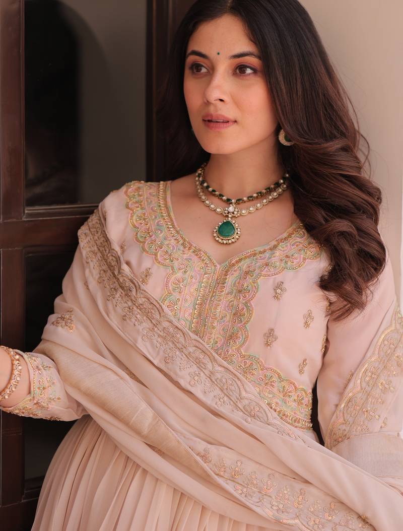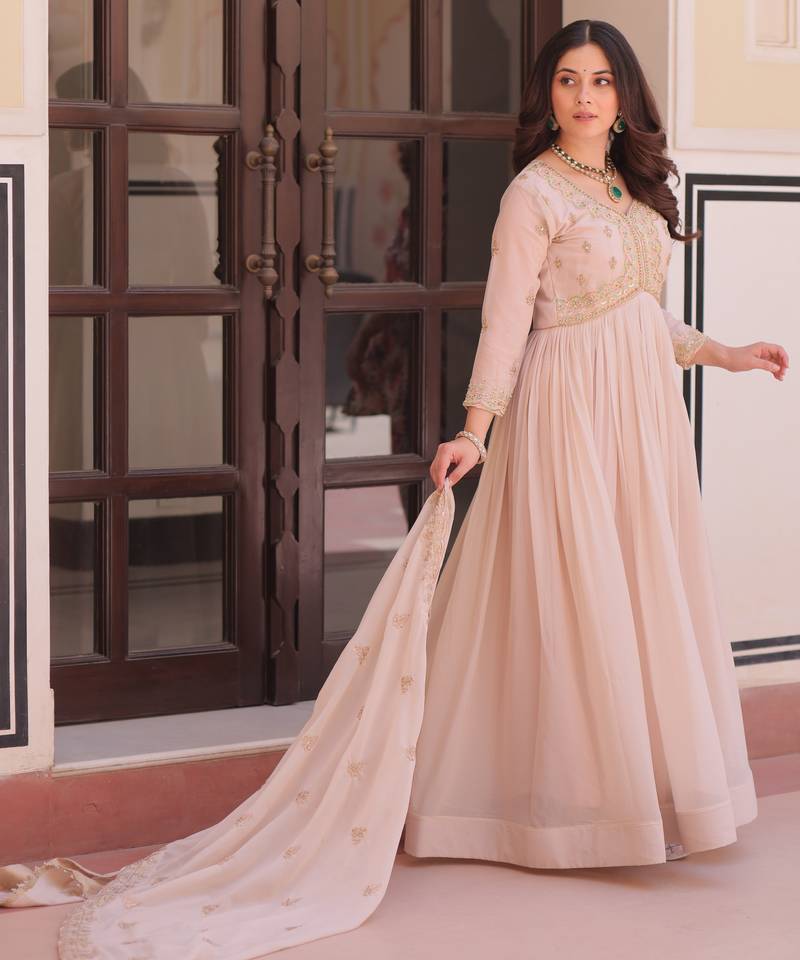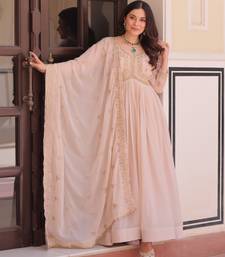 Beige star georgette embroidered designer anarkali gown with dupatta stitched