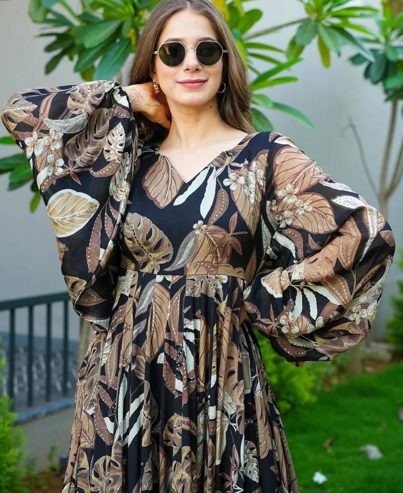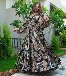 Black digital printed air tex chinon traditional anarkali gown stitched