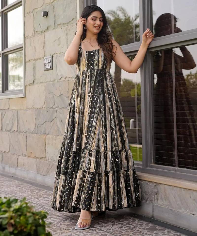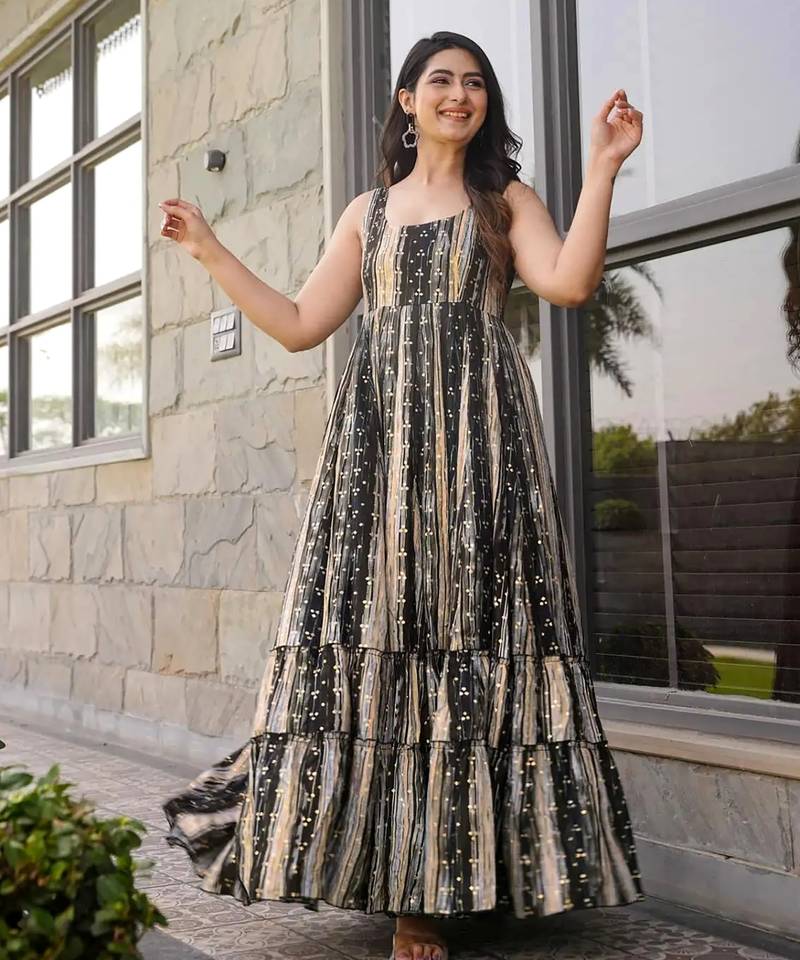 Black digital printed rayon traditional anarkali gown stitched