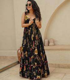 Black digital printed rayon traditional anarkali gown stitched