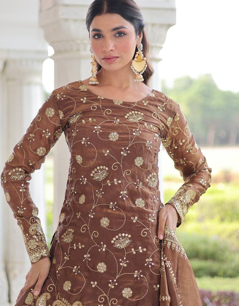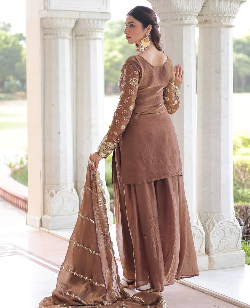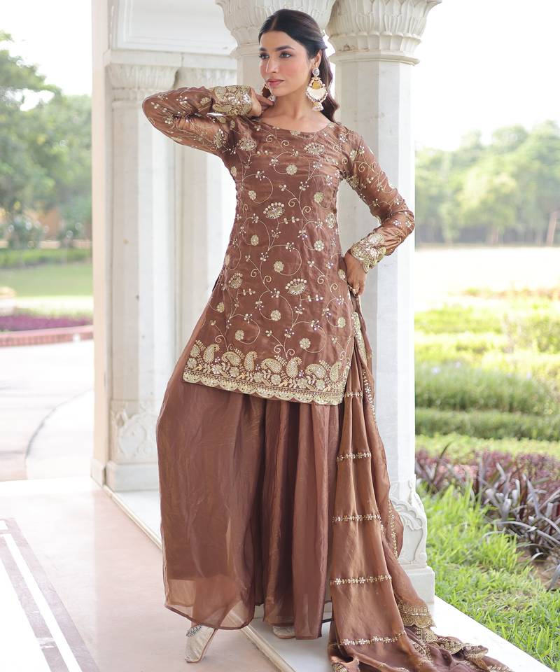 Coffee fendy embroidered designer sharara suit with dupatta stitched