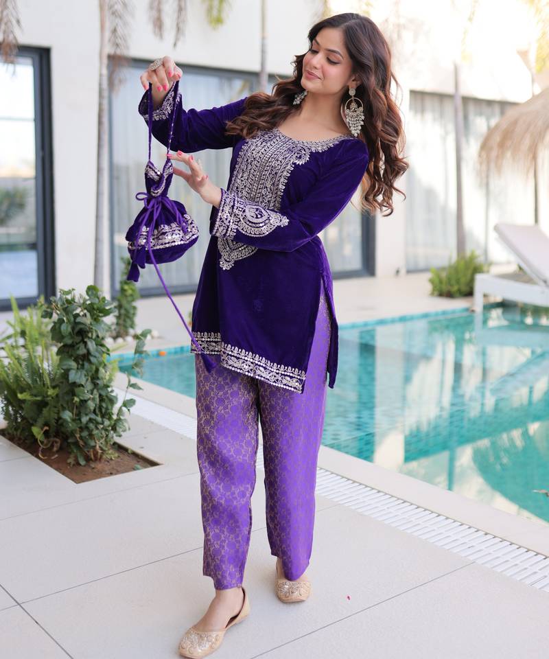 Dark purple velvet embroidered designer kurta set with batwa stitched