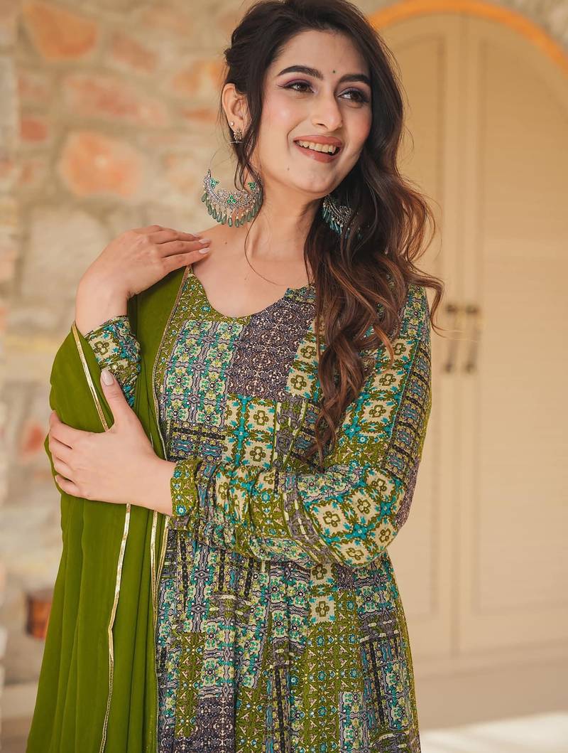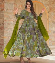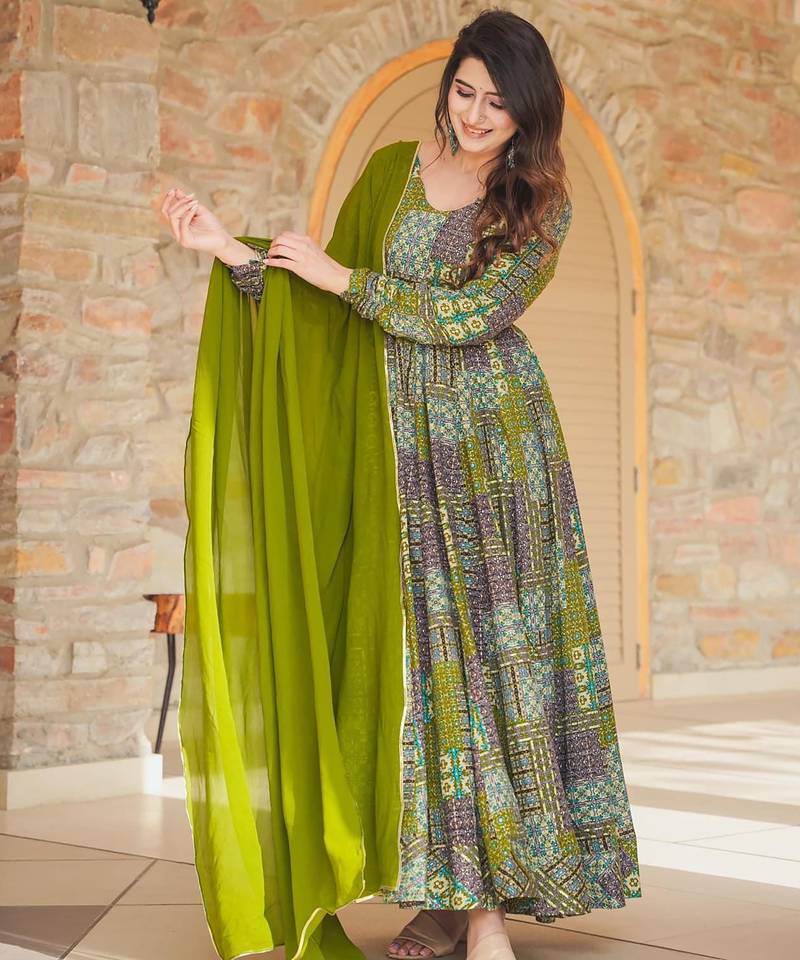 Green digital printed rayon traditional anarkali gown with dupatta stitched