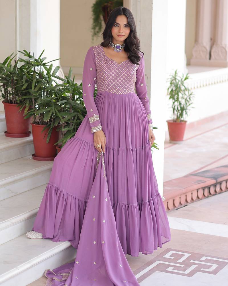 Lavender faux georgette embroidered designer anarkali gown with dupatta stitched