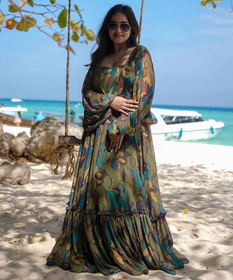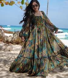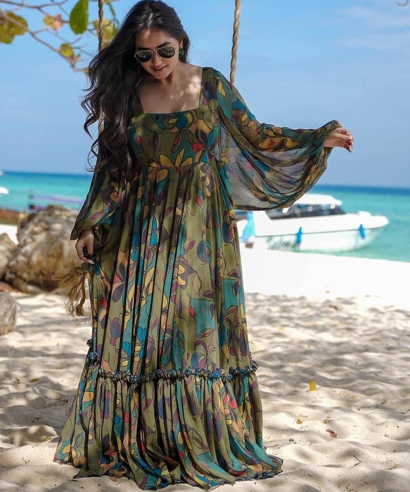 Mehendi digital printed georgette traditional anarkali gown stitched
