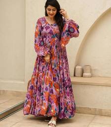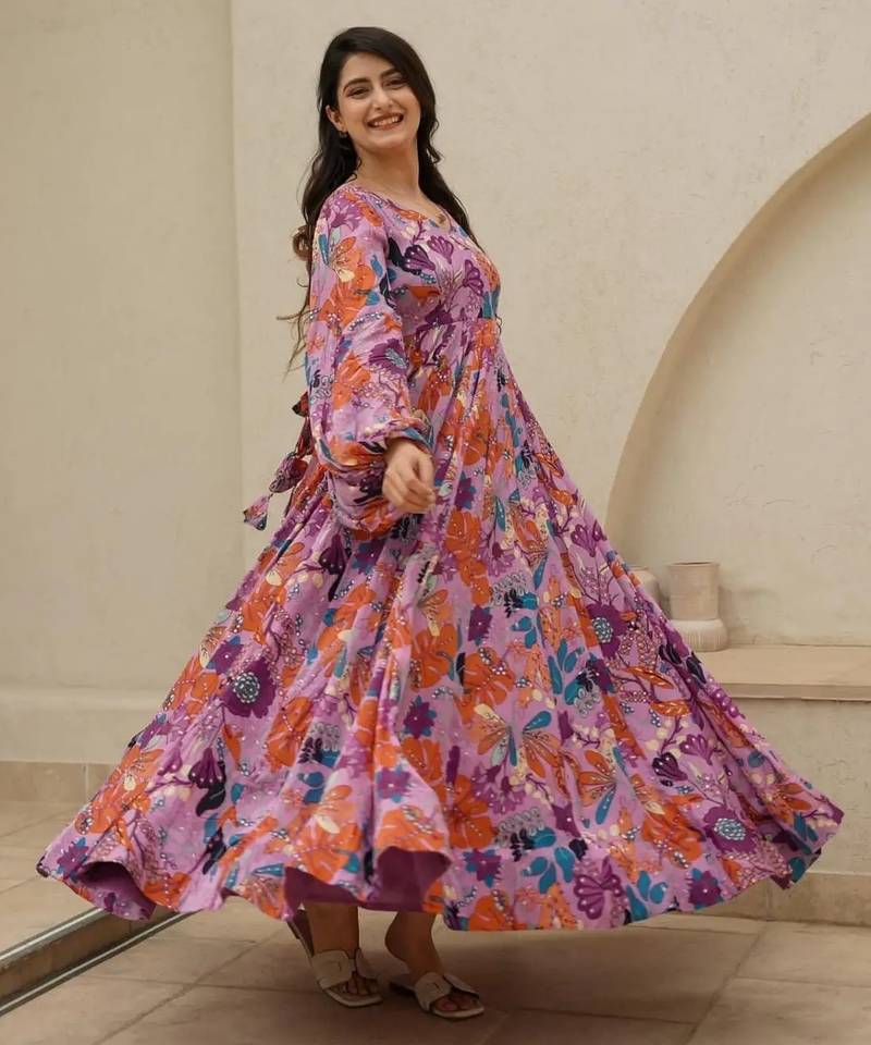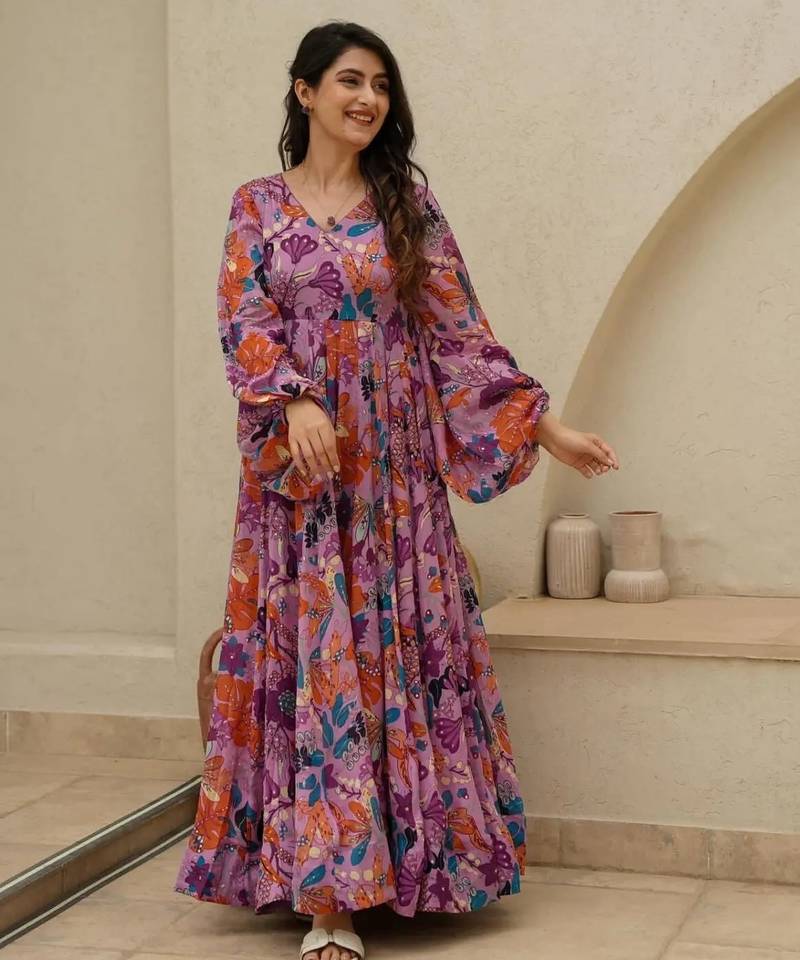 Multicolor digital printed air tex chinon traditional anarkali gown stitched