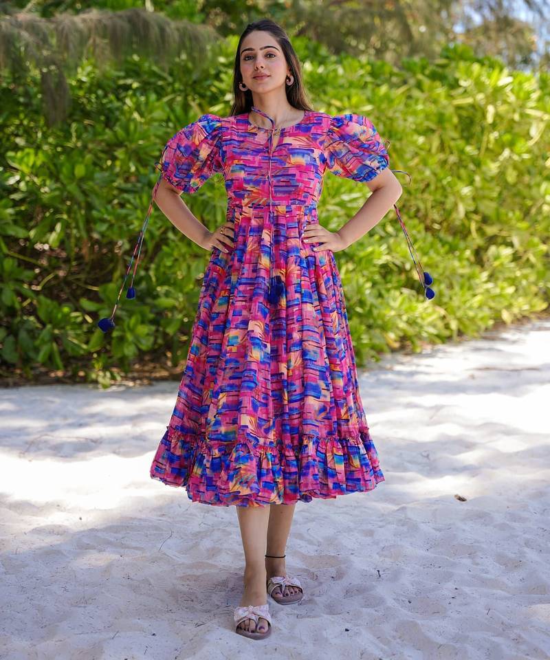 | Product Name | Multicolor Digital Printed Rayon Fit & Flare Long Dress | |