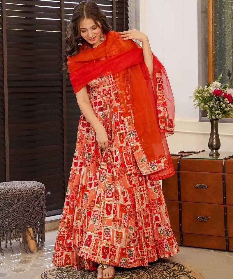 Red digital printed silk traditional anarkali gown with dupatta stitched