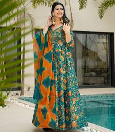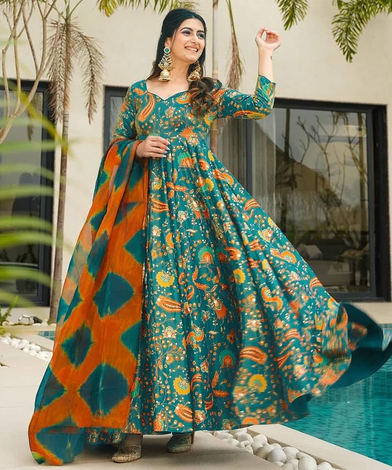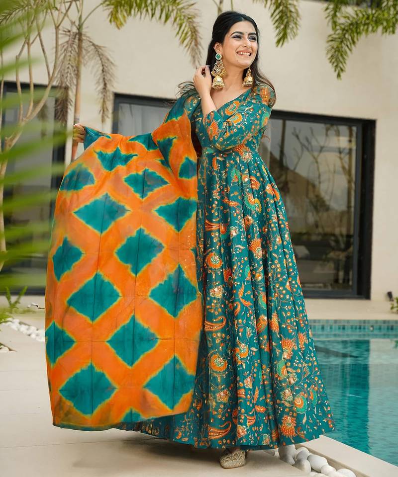 Teal digital printed silk traditional anarkali gown with dupatta stitched