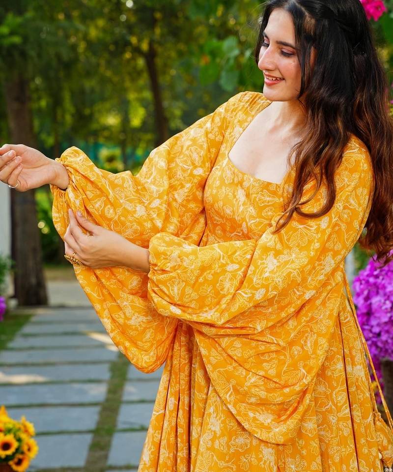 Yellow digital printed georgette traditional anarkali gown stitched