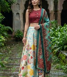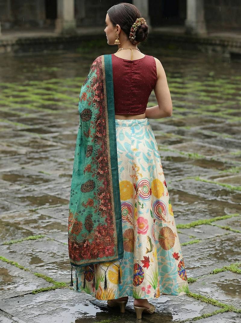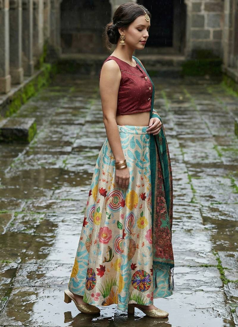 Decorative print satin semi stitched lehenga choli & unstitched blouse with dupatta