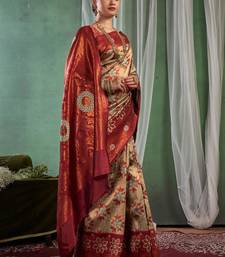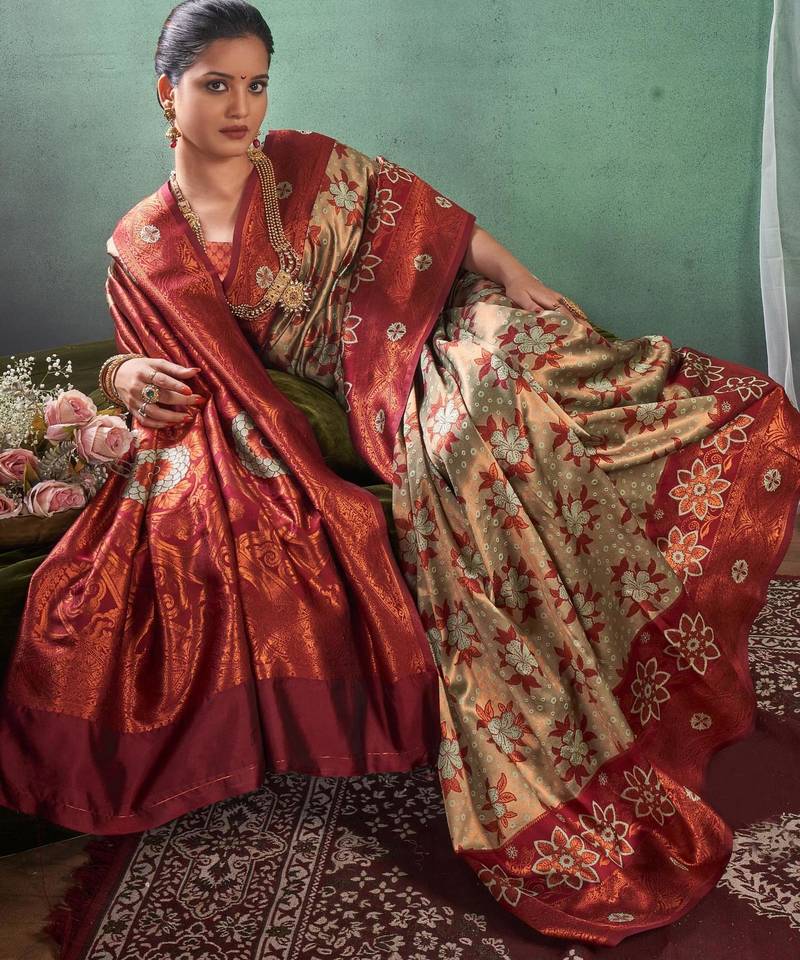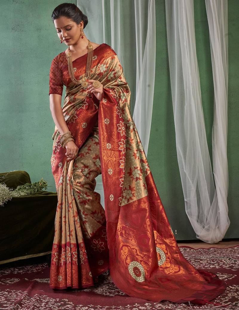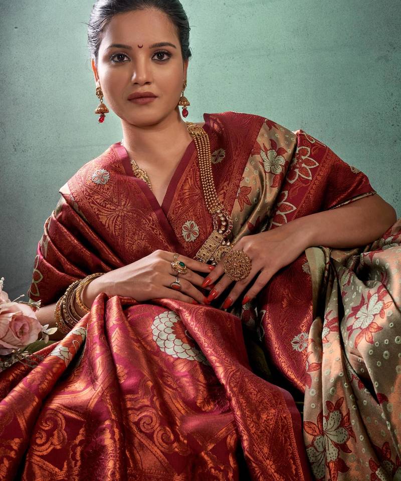 Floral maroon banarasi south silk fancy saree with unstitched blouse
