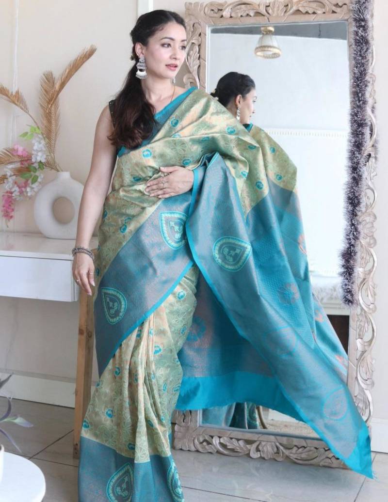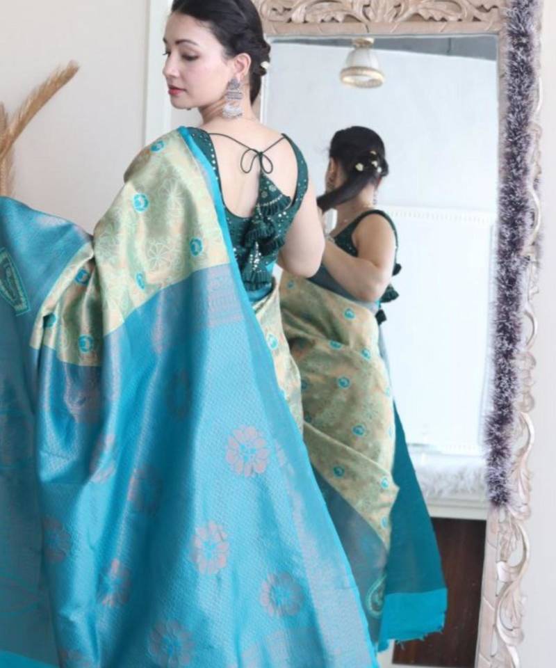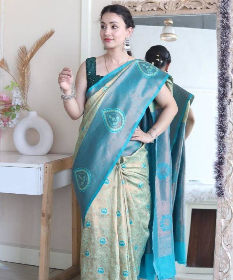 Floral rama green woven pure silk blend multicolor saree with unstitched blouse