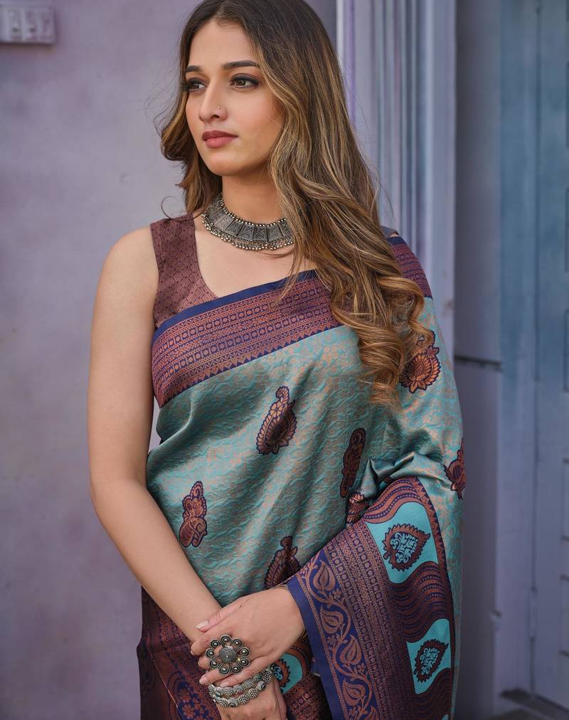 Soft sky blue banarasi art silk jacquard saree with unstitched blouse