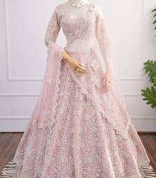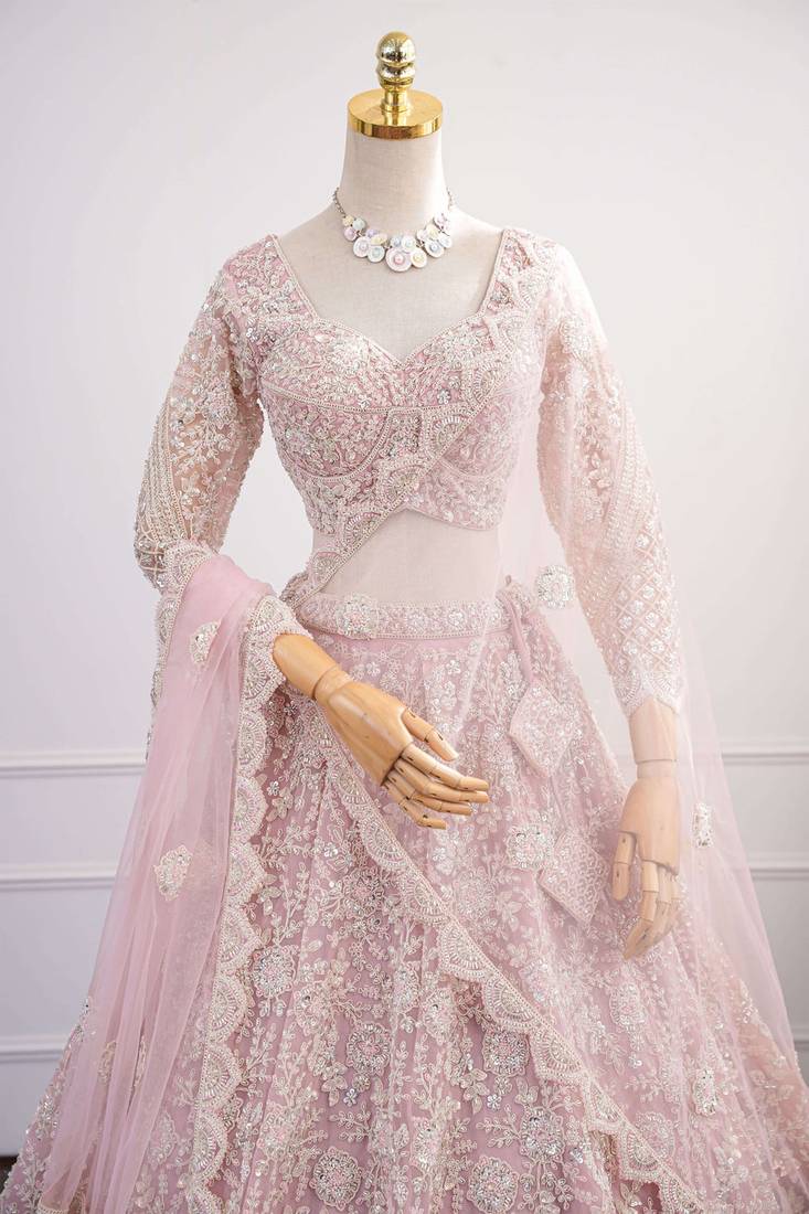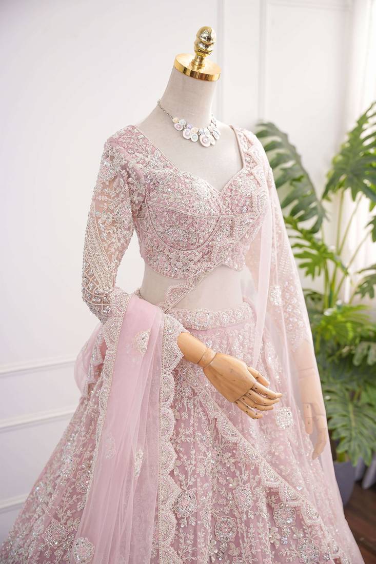 Baby pink dori & beads embroidered net lehenga choli with dupatta