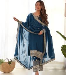 | Product Name | Teal Blue Embroidered Sequins Zari Work Pure Chinon Silk Fully Stitched Kurta Sharara Set | |