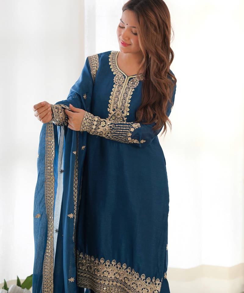 Teal blue embroidered sequins zari work pure chinon silk fully stitched kurta sharara set