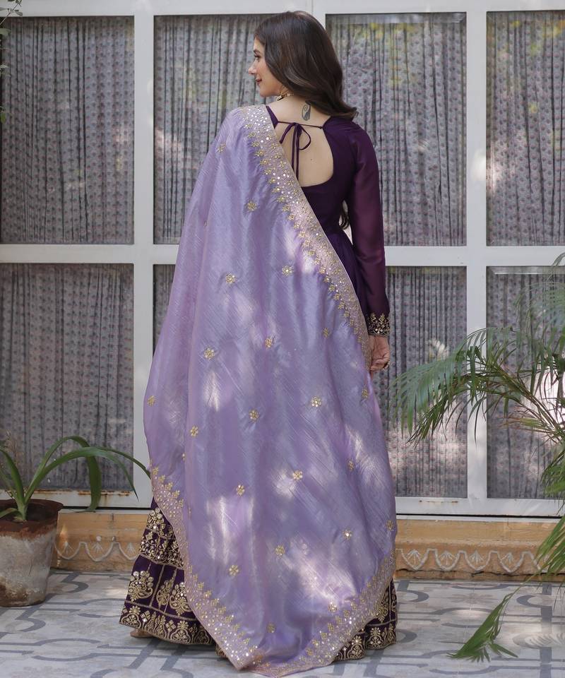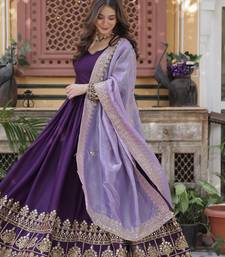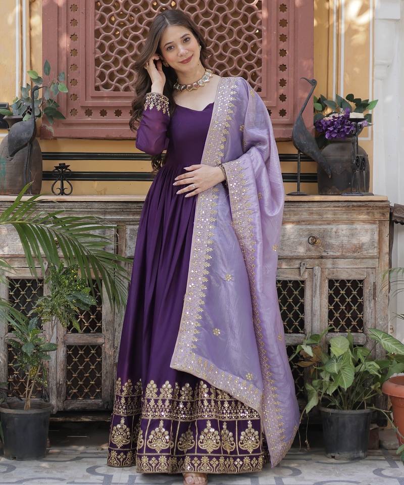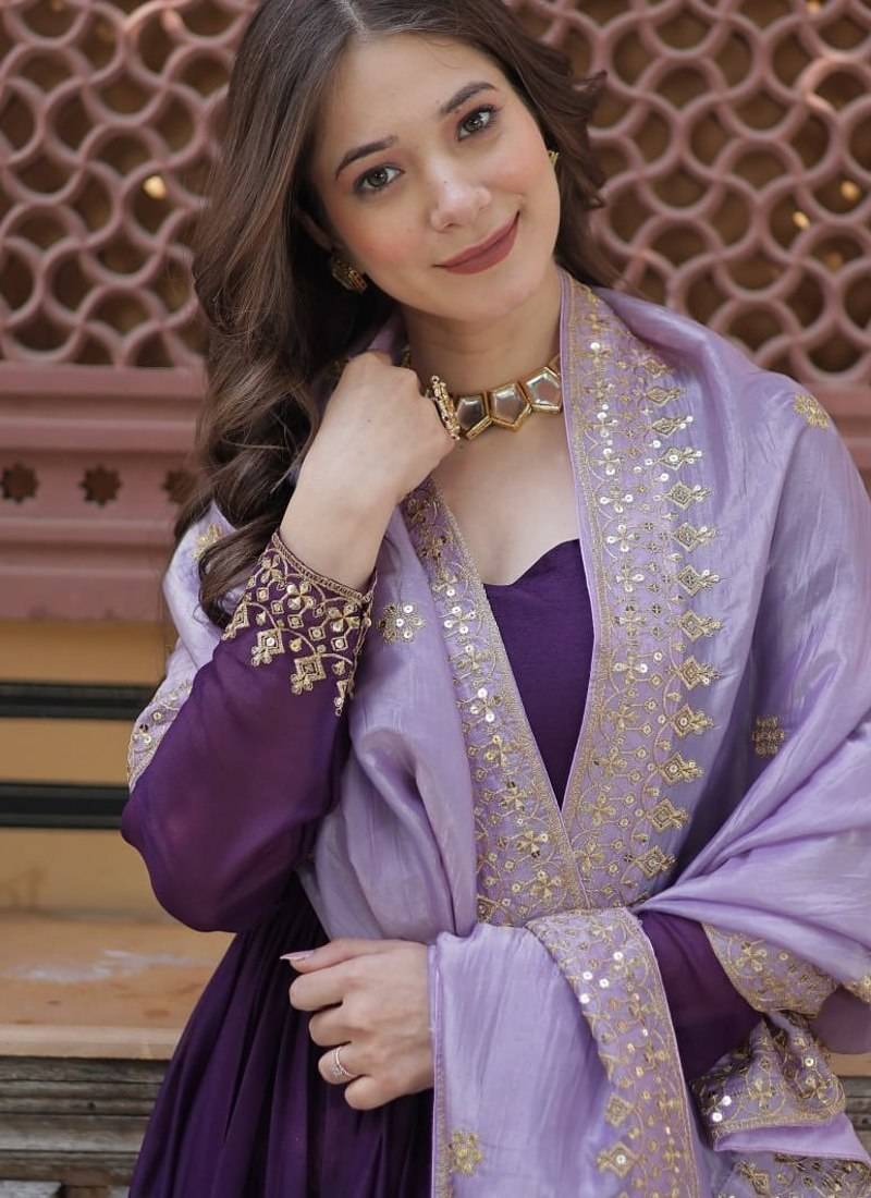 Purple embroidered star georgette anarkali gown with zari sequins – party wear stitched