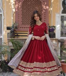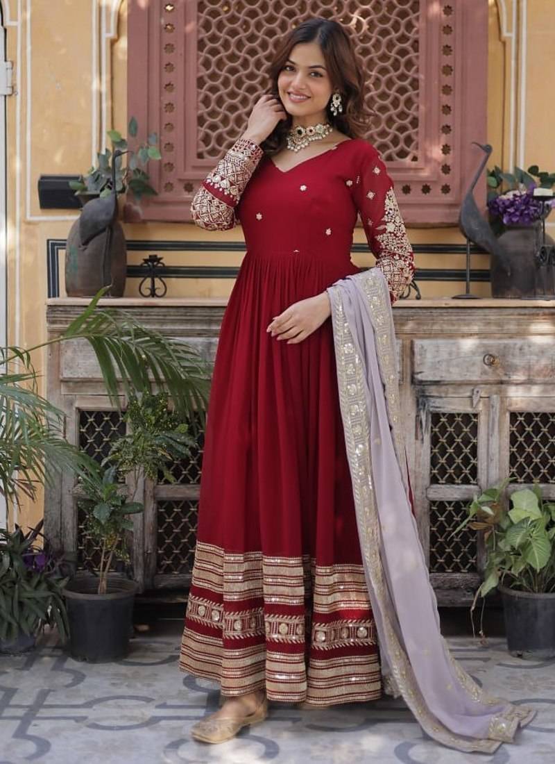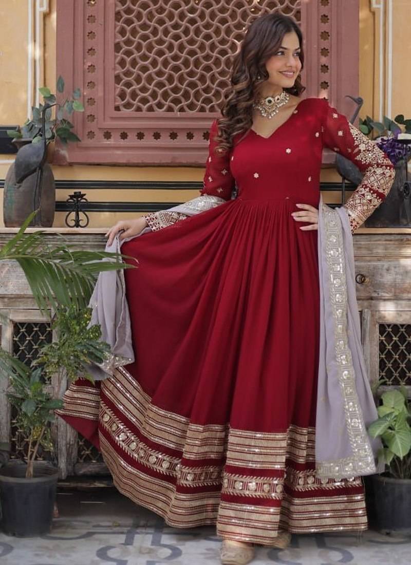 Red embroidered faux blooming anarkali gown with zari sequins – party wear stitched