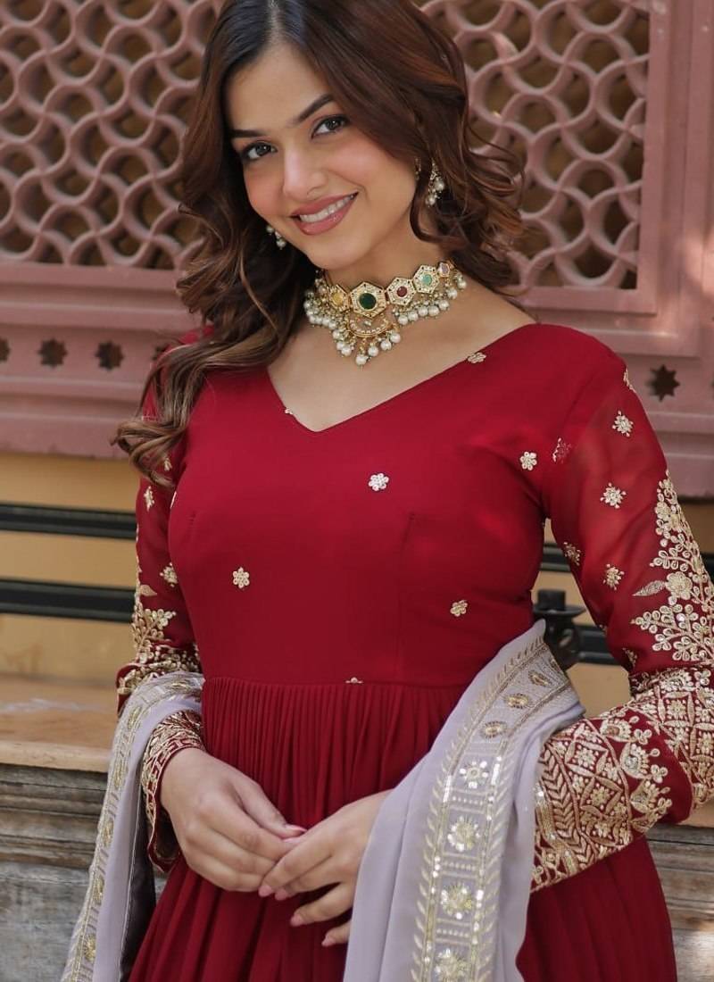 | Product Name | Red Embroidered Faux Blooming Anarkali Gown With Zari Sequins – Party Wear | |