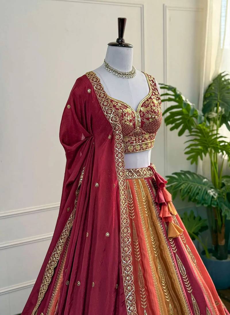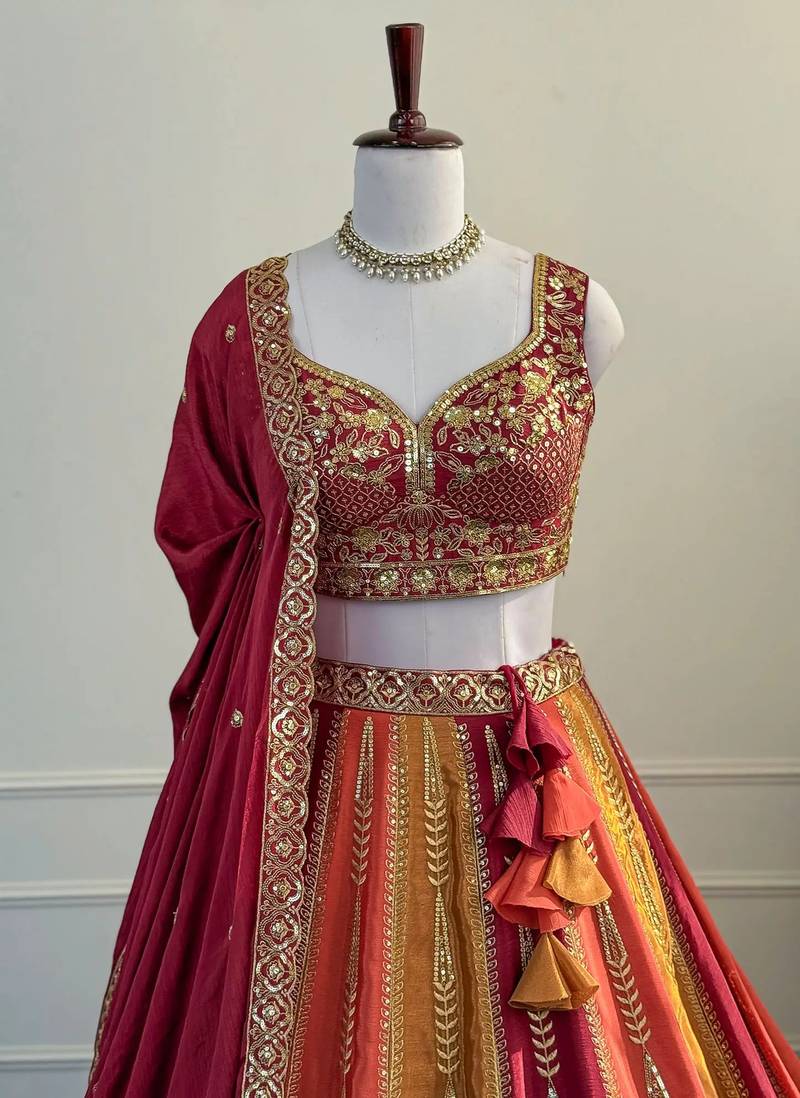 Product Name Red Zari & Sequins Embroidered Chinon Silk Lehenga Choli With Dupatta