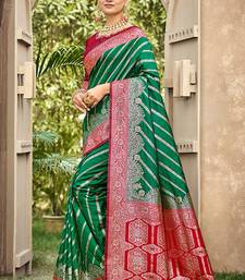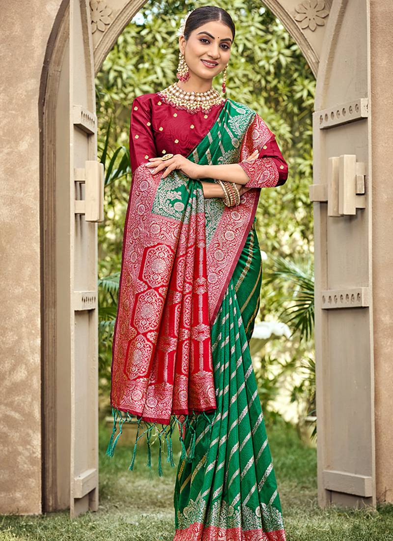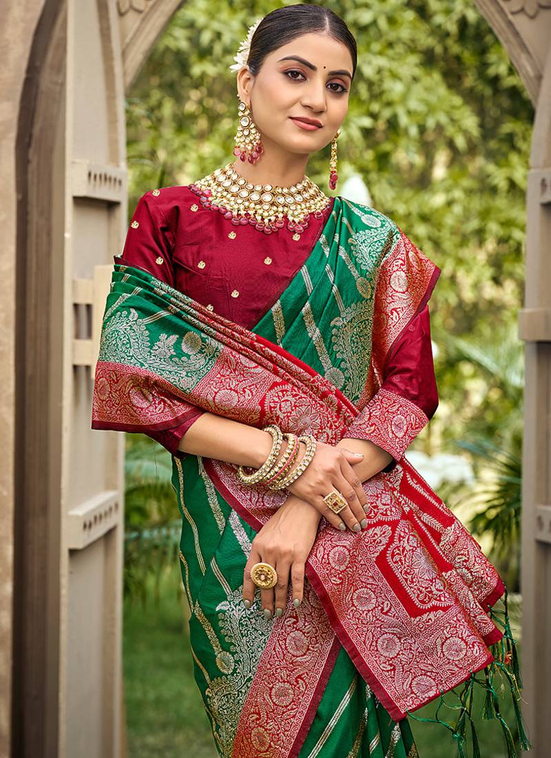 Bottle green & red banarasi silk saree with heavy woven zari work