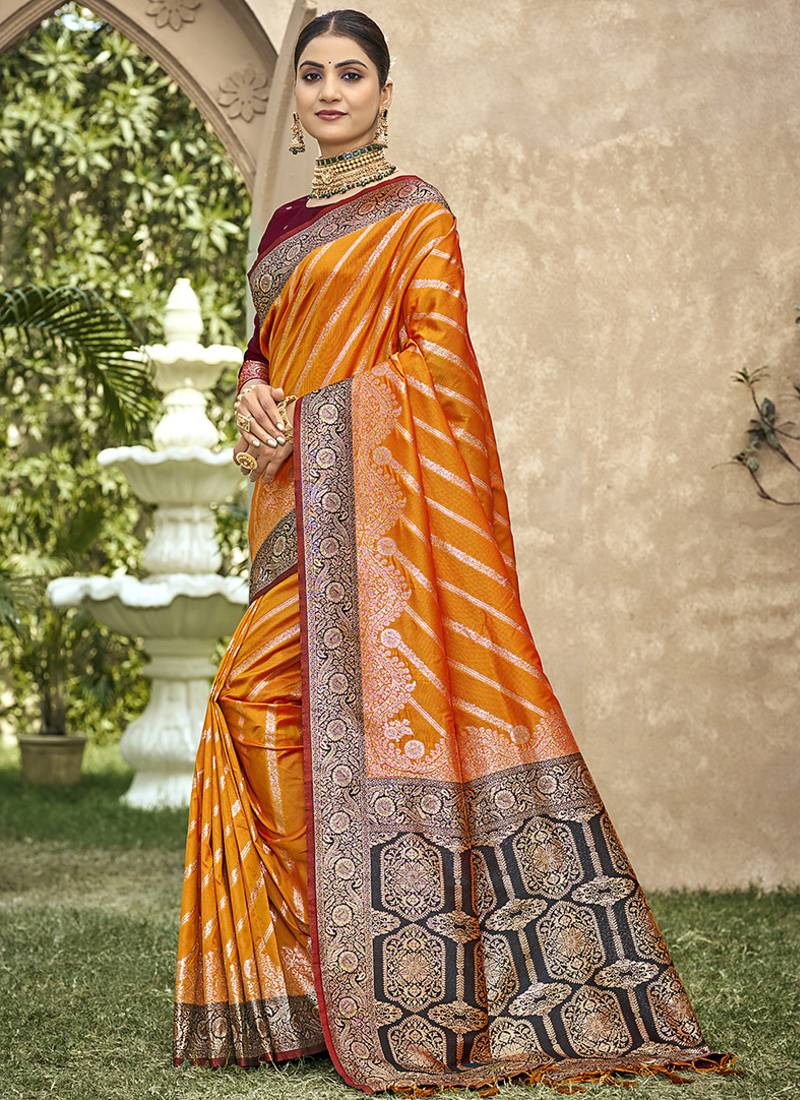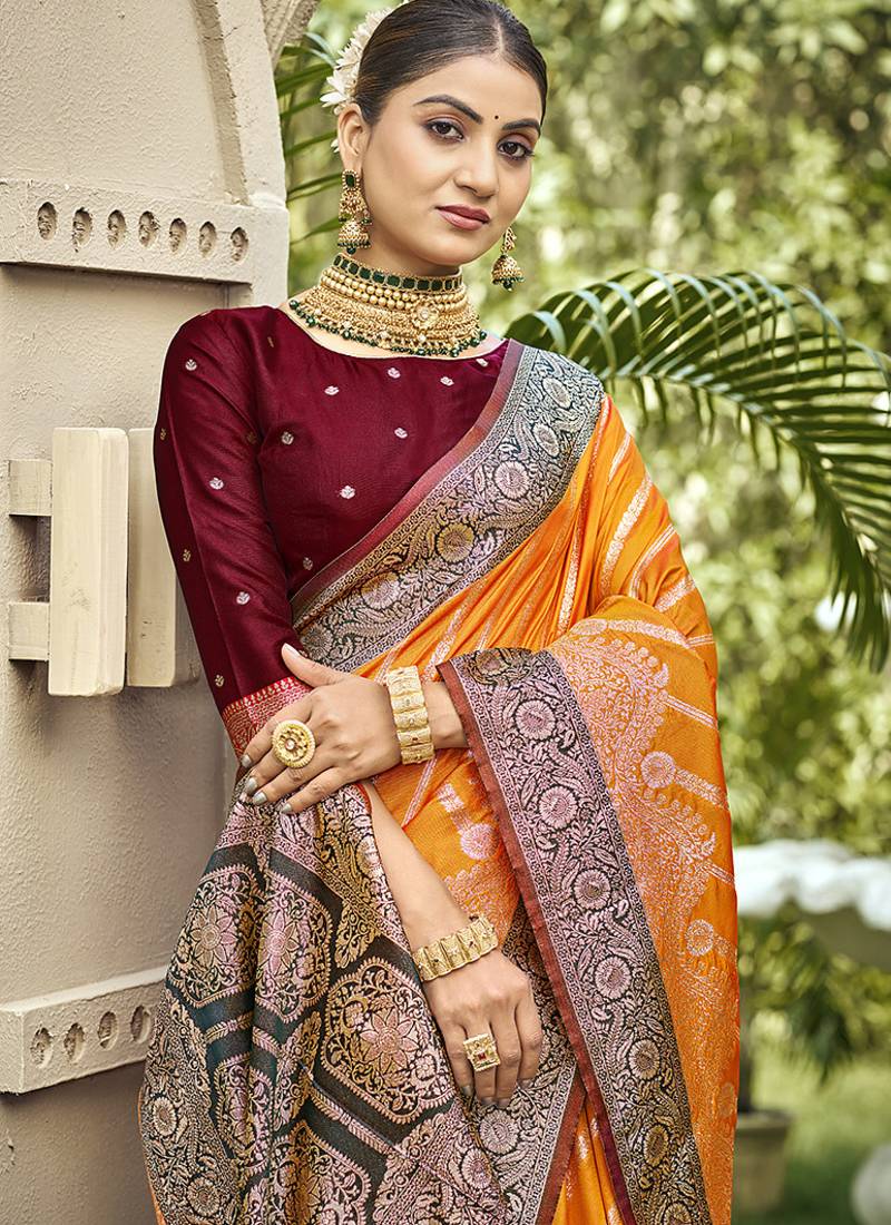 Elegant orange banarasi silk saree with maroon contrast blouse